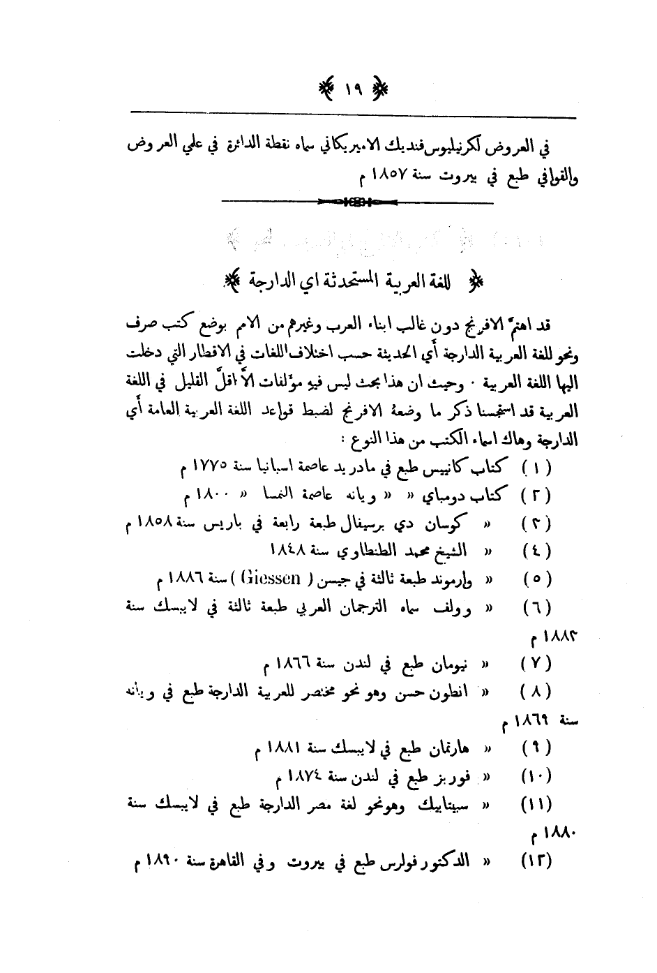 قد اهتم الافرنج دون غالب ابناء العرب وغيرهم من الامم بوضع كتب صرف ونحو للغة العربية الدارجة الحديثة حسب اختلاف اللغات في الاقطار التي دخلت اليها اللغة العربية. وحيث أن هذا بحث ليس فيه مؤلفات الا اقل القليل في اللغة العربية قد احتجنا ذكر ما وضعه الافرنج لضبط قواعد اللغة العربية العامة أي الدارجة وهاك اسماء الكتب من هذا النوع 1 - كتاب كانيس طبع في مدريد عاصمة اسبانيا سنة 1775م.