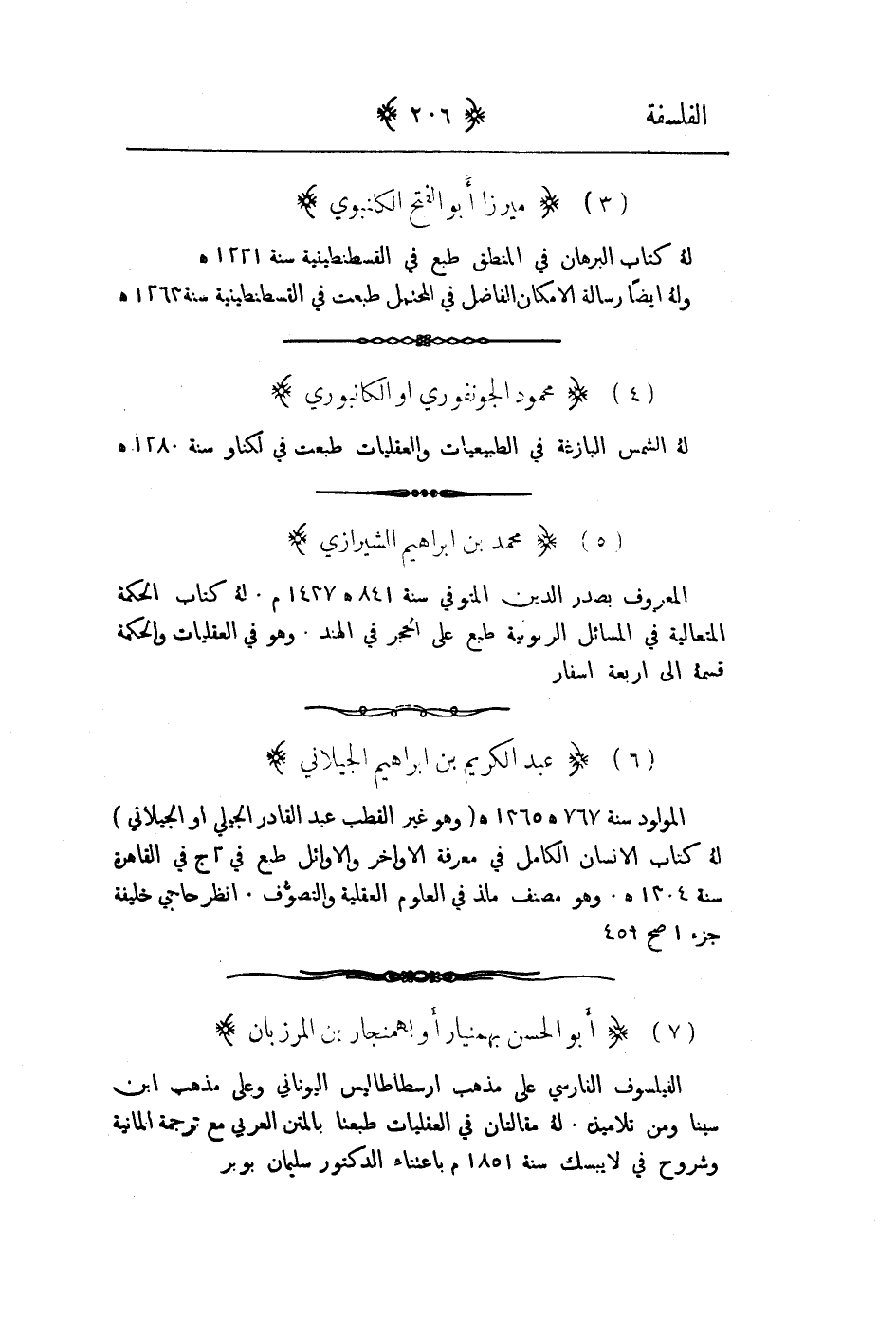 الفيلسوف الفارسي على مذهب ارسطوطاليس اليوناني وعلى مذهب ابن سينا ومن تلامذته. له مقالتان في العقليات طبعتا بالمتن العربي مع ترجمة المانية وشروح في لايبسك سنة 1851م باعتناء الدكتور سليمان بوبر.
