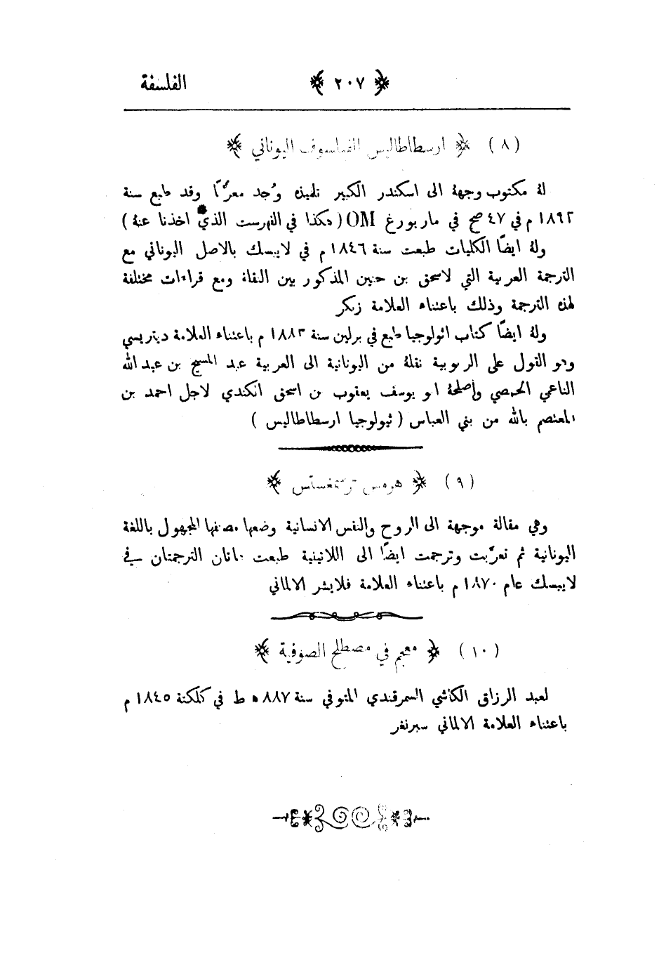 له مكتوب وجهه الى الاسكندر الكبير تلميذه وجد معرباً وقد طبع سنة 1892م في 47 صح في ماربورغ OM " هكذا في الفهرست الذي اخذنا عنه " وله ايضا الكليات طبعت سنة 1846م في لايبسك بالاصل اليوناني مع الترجمة العربية التي لاسحق بن حنين المذكور بين النقلة ومع قراءات مختلفة لهذه الترجمة وذلك باعتناء العلامة زنكر.
