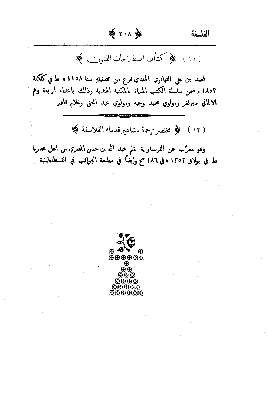 لمحمد بن علي التهانوي الهندي فرغ من تصنيفة سنة 1158هـ في كلكته 1853 م ضمن سلسلة الكتب المسماة بالمكتبة الهندية مذلك باعتناء الربعة مهم الالماني سيرنغر ومولوي محمد وجيه ومولوي عبد الحق وغلام قادر.