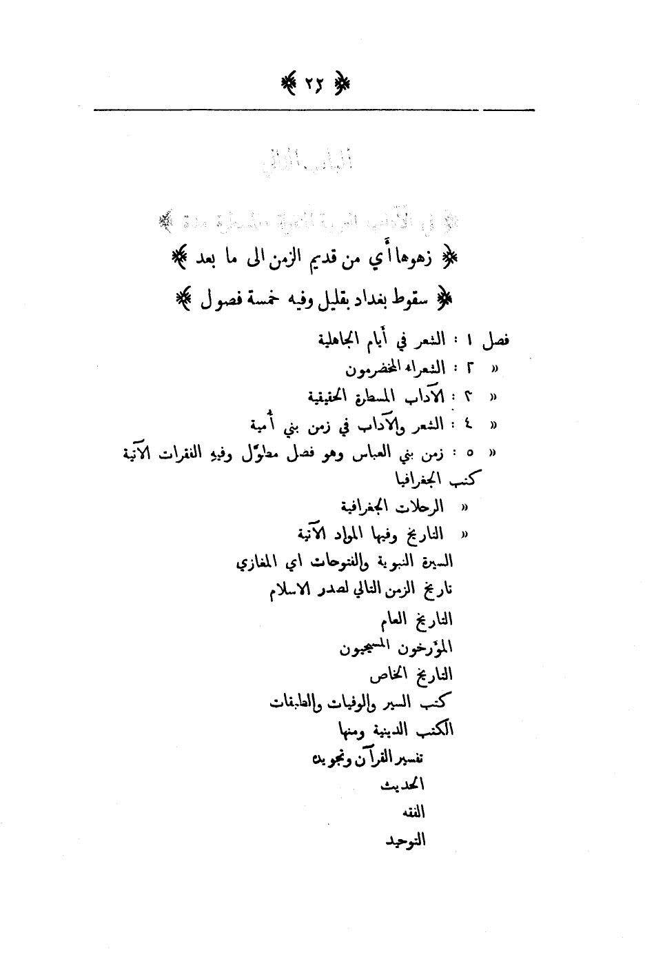 والمسطرة مدة زهوها اي من قديم الزمان الى ما بعد سقوط بغداد بقليل وفيه خمسة فصول فصل 1: الشعر في أتخر الجاهلية فصل 2: الشعراء المخضرمون فصل 3: الآداب المسطرة الحقيقية فصل 4: الشعر والآداب في زمن بني امية فصل 5: زمن بني العباس وهو فصل معول وفيه الفقرات الآتية كتب الجغرافية كتب الرحلات الجغرافية كتب التاريخ وفيها المواد الآتية السيرة النبوية والفتوحات أي الغزوات تاريخ الزمن التالي لصدر الإسلام التاريخ العام المؤرخون المسيحيون التاريخ الخاص كتب السير والوفيات والطبقات الكتب الدينية ومنها تفسير القرآن وتجويده الحديث الفقه التوحيد