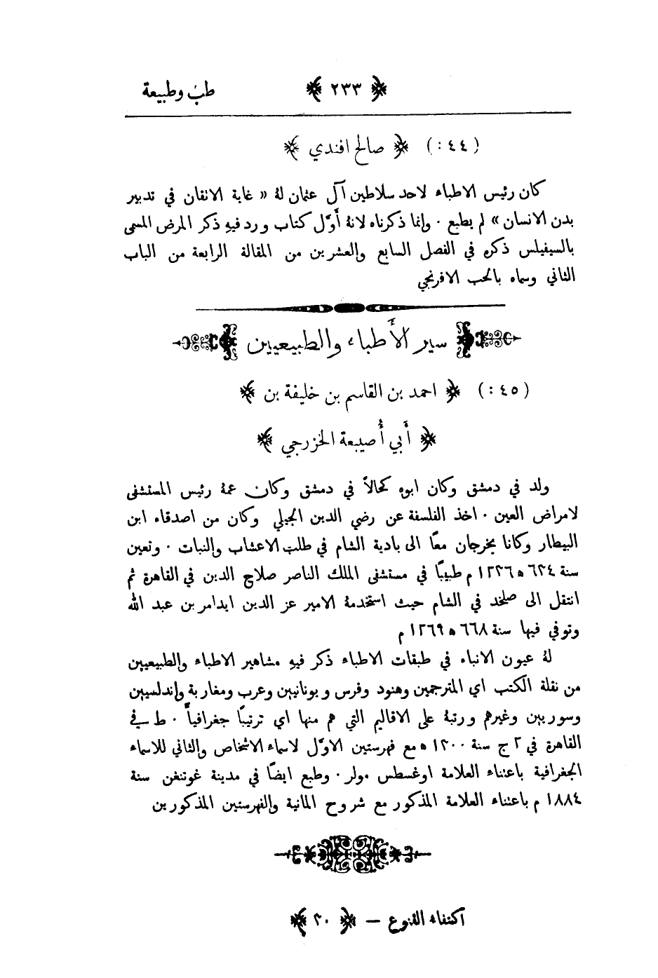 له عيون الانباء في طبقات الاطباء ذكر فيه مشاهير الاطباء والطبيعيين من نقلة الكتب أي المترجمين وهنود وفرس ويونانيين وعرب ومغاربة واندلسيين وسوريين وغيرهم ورتبه على الاقاليم التي هم منها أي ترتيباً جغرافياً. طبع في القاهرة في 2ج سنة 1300هـ مع فهرستين الاول لاسماء الاشخاص والثاني للاسماء الجغرافية باعتناء العلامة أغسطس مولر. وطبع أيضاً في مدينة غوتنغن سنة 1884م باعتناء العلامة المذكور مع شروح المانية والفهرسين مذكورين.