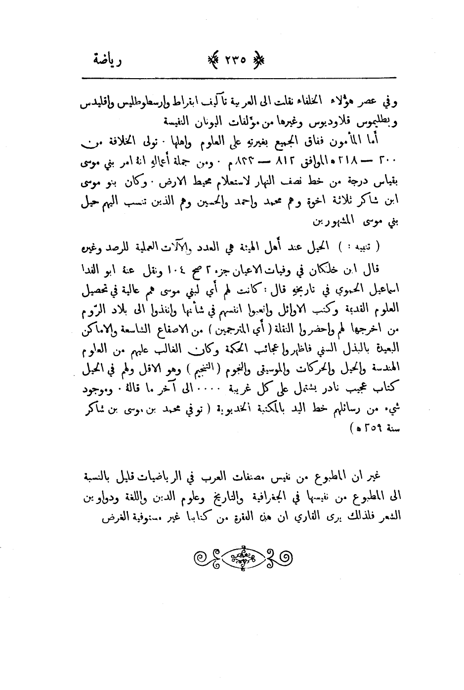 قال ابن خلكان في وفيات الاعيان جزء 2صح 104 ونقل عنه ابو الفدا اسماعيل الحموي في تاريخه قال: كانت لهم أي لبني موسى همم عالية في تحصيل العلوم القديمة وكتب الاوائل واتعبوا انفسهم في شأنها ونفذوا إلى بلاد اروم من اخرجها لهم واحضروا النقلة أي " المترجمين " من الاصقاع الشاسعة والاماكن البعيدة بالبذل السني فاظهروا عجائب الحكمة وكان الغالب عليهم من العلوم الهندسة والحيل والحركات والموسيقى والنجوم " التنجيم وهو الاقل ولهم في الحيل كتاب عجيب نادر يشتمل على كل غريبة ... إلى اخر ما قاله. وموجود شيء من رسائلهم خط اليد بالمكتبة الخديوية " توفي محمد بن موسى بن شاكر سنة 259هـ " غير أن المطبوع من نفيس مصنفات العرب في الرياضيات قليل بالنسبة إلى المطبوع من نفيسها في الجغرافية والتاريخ وعلوم الدين واللغة ودواوين الشعر فلذلك يرى القارئ إن هذه الفقرة من كتابنا غير مستوفية الغرض.