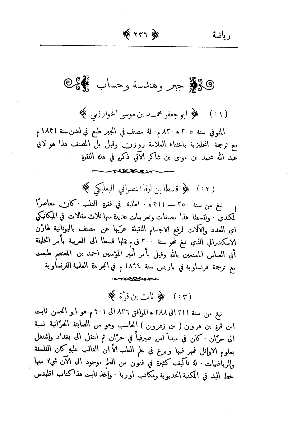 نبغ من سنة 211 - 288هـ الموافق 826 - 901م هو ابو الحسن ثابت ابن قرة بن هارون " بن زهرون " الحاسب وهو من الصابئة الحرانية نسبة إلى حران. كان في مبدأ امره صيرفياً في حران ثم انتقل إلى بغداد واشتغل بعلوم الاوائل فمهر فيها وبرع في علم الطب إلى أن الغالب عليه كان الفلسفة والرياضيات. له تآليف كثيرة في فنون من العلم موجود إلى الان شيء منها خط اليد في المكتبة الخديوية ومكاتب اوربا. واخذ ثابت هذا كتاب اقليدس