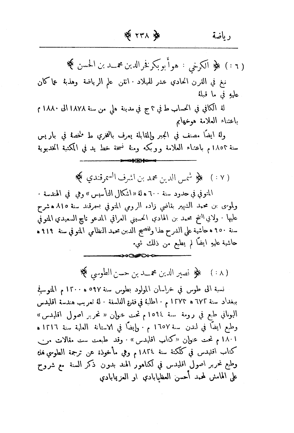 نسبة إلى طوس في خراسان المولود بطوس سنة 597هـ 1200م المتوفى ببغداد سنة 672هـ 1273م. اطلبه في فقره الفلسفة. له تعريب هندسة اقليدس اليوناني طبع في روما سنة 1594م تحت عنوان " تحرير اصول اقليدس " وطبع أيضاً في لندن سنة 1657م. وأيضاً في الاستانة العلية سنة 1216هـ 1801م تحت عنوان " كتاب اقليدس ". وقد طبعت ست مقالات من كتاب افليدس في كلكته سنة 1824م وهي مأخوذة عن ترجمة الطوسي هذه وطبع تحرير اصول اقليدس في لكناهور الهند بدون ذكر السنة مع شروح على الهامش لمحمد احسن العظيمابادي او العزيمابادي.