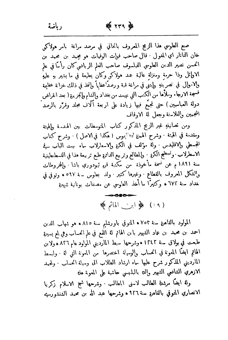 ومن تصانيفه غير الزيج المذكور كتاب المتوسطات بين الهندسة والهيئة ومقدمة في الهيئة. وشرح الهمزة لبطليموس " هكذا في الاصل ". وشرح كتاب المجسطي والاقليدس. وله مؤلف في الكرة والاسطورلاب سماه بيت الباب في للاسطورلاب. وتسطح الكرة. والمطالع وتربيع الدائرة طبع تربيعه هذا في القسطنطينية سنة 1891م عن نسخة مأخوذة من مكتبة فره ثيودوري باشا. والمخروطات والشكل المعروف بالقطاع. وغيرها كثير. ولد بطوس سنة 597هـ المتوفى في بغداد سنة 672هت وكثيراً ما اخذ الطوسي عن مصنفات يونانية كثيرة.