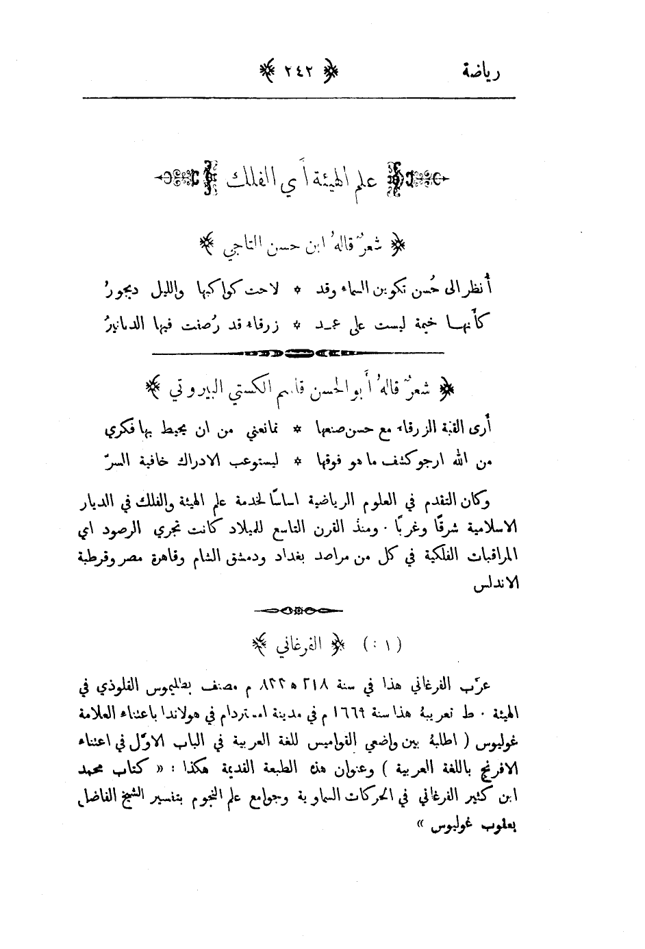 عرب القوغاني هذا في سنة 218هـ 833م مصنف بطليموس القلوذي في الهيئة. طبع تعريبه هذا سنة 1699م في مدينة امستردام في هولندا باعتناء العلامة غوليوس " اطلبه بين واضعي القواميس للغة العربية في الباب الاول في اعتناء الافرنج باللغة العربية " وعنوان هذه الطبعة القديمة هكذا " كتاب محمد ابن كثير الفرغاني في الحركات السماوية وجوامع علم النجوم بتفسير الشيخ الفاضل يعقوب غوليوس "
