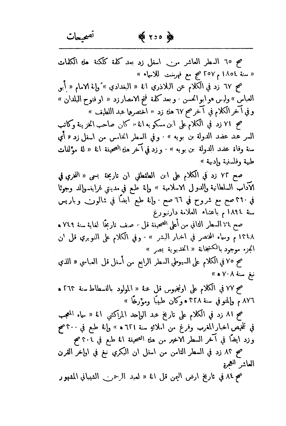 صح 65 السطر العاشر من اسفل زد بعد كلمة كلكتة هذه الكلمات " سنة 1854م 257صح مع فهرست للاسماء " صح 67 زد في الكلام عن البلاذي انه " البغدادي " وانه الامام " ابو العباس " وليس هو ابو الحسن. وبعد كلمة فتح الامصار زد " او فتوح البلدان " وفي اخر الكلام في اخر صح 67 هذه زد " اختصرهما عبد اللطيف " صح 71 زد في الكلام على ابن مسكويه إنه " كان صاحب الخزينة وكاتب السر عند عضد الدولة بن بوية ". وفي السطر الخامس من اسفل زد " أي سنة وفاة عضد الدولة بن بوية ". وزد في اخر هذه الصحيفة إنه " له مؤلفات طبية وفلسفية وادبية " صح 72 زد في الكلام على ابن الطقطقي إن تأريخه يسمى " الفخري في الآداب السلطانية والدول الاسلامية " وإنه طبع في مدينتي اغرايفسوالد وجوثا في 390صح مع شروح في 66صح. وإنه طبع ايضاً في شالون وباريس سنة 1894م باعتناء العلامة دارنبورغ صح 74 السطر الثاني من اعلى الصحيفة قل " صنف تاريخاً لغاية سنة 749هـ 1348م وسماه المختصر في اخبار البشر ". وفي الكلام على النويري قل ان الجزء موجود بالكتبخانة " الخديوية بمصر " صح 75 في الكلام على السيوطي السطر الرابع من اسفل قل العباسي " الذي نبغ سنة 708هـ " صح 77 قي الكلام على اوتنجيوس قل عنه " المولود بالفسطاط سنة 263هـ 876م والمتوفى سنة 328هـ وكان طبيبا ومؤرخا " صح 81 زد في الكلام على تاريخ عبد الواحد المراكشي انه " سماه المعجب في تلخيص اخبار المغرب وفرغ من املائه سنة 621هـ " وانه طبع في 300صح وزد ايضا في اخر السطر الاخير من هذه الصحيفة انه طبع في 304صح صح 83 زد في السطر الثامن من اسفل ان البكري نبغ في اواخر القرن العاشر للهجرة صح84 في تاريخ ارض اليمن قل انه " لعبد الرحمان الشيباني المشهور