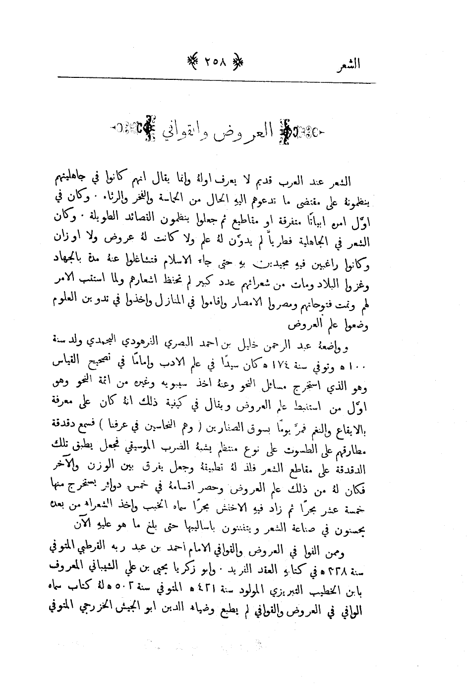 الشعر عند العرب قديم لا يعرف اوله وإنما يقال إنهم كانوا في جاهليتهم ينظمونه على مقتضى ما تدعوهم اليه الحال من الحماسة والفخر والرثاء. وكان في اول امره ابياتاً متفرقة او مقاطع ثم جعلوا ينظمون القصائد الطويلة. وكان الشعر في الجاهلية فطرياً لم يدون له علم ولا كانت له عروض ولا اوزان وكانوا راغبين فيه مجيدين به حتى جاء الاسلام فتشاغلوا عنه مدة بالجهاد وغزوات البلاد ومات من شعرائهم عدد كبيراً ولم تحفظ اشعارهم ولما استتب الامر لهم وتمت فتوحاتهم ومصروا الامصار واقاموا في المنازل واخذوا في تدوين العلوم وضعوا علم العروض. وواضعه عبد الرحمن بن خليل بن أحمد البصري الفرهودي اليحمدي ولد سنة 100هـ المتوفى سنة 174هـ كان سيداً في علم الادب واماماً في تصحيح القياس وهو الذي استخرج مسائل النحو وعنه اخذ سيبويه وغيره من ائمة النحو وهو اول من استنبط علم العروض ويقال في كيفية ذلك إنه كان على معرفة بالايقاع والنغم فمر يوماً بسوق الصفارين وهم النحاسين في عرفنا فسمع دقدقة مطارقهم على الطسوت على نوع منتظم يشبه الضرب الموسيقي فجعل يطبق تلك الدقدقة على مقاطع الشعر فلذ له تطبيقه وجعل يفرق بين الوزن والاخر فكان له من ذلك علم العروض وحصر اقسامه في خمس دوائر يستخرج منها خمسة عشر بحراً ثم زاد فيه الاخفش بحراً سماه الخبب واخذ الشعراء من بعده يحسنون في صناعة الشعر ويتفننون باساليبها حتى بلغ ما هو عليه الان وممن ألفوا في العروض والقوافي الامام بن عبد ربه القرطبي المتوفى سنة 328هـ في كتابه العقد الفريد. وابو زكريا يحيى بن علي الشيباني المعروف بابن الخطيب التبريزي المولود سنة 421هـ المتوفى سنة 502هـ له كتاب سماه الوافي في العروض والقوافي لم يطبع وضياء الدين ابو الجيش الخزرجي المتوفى