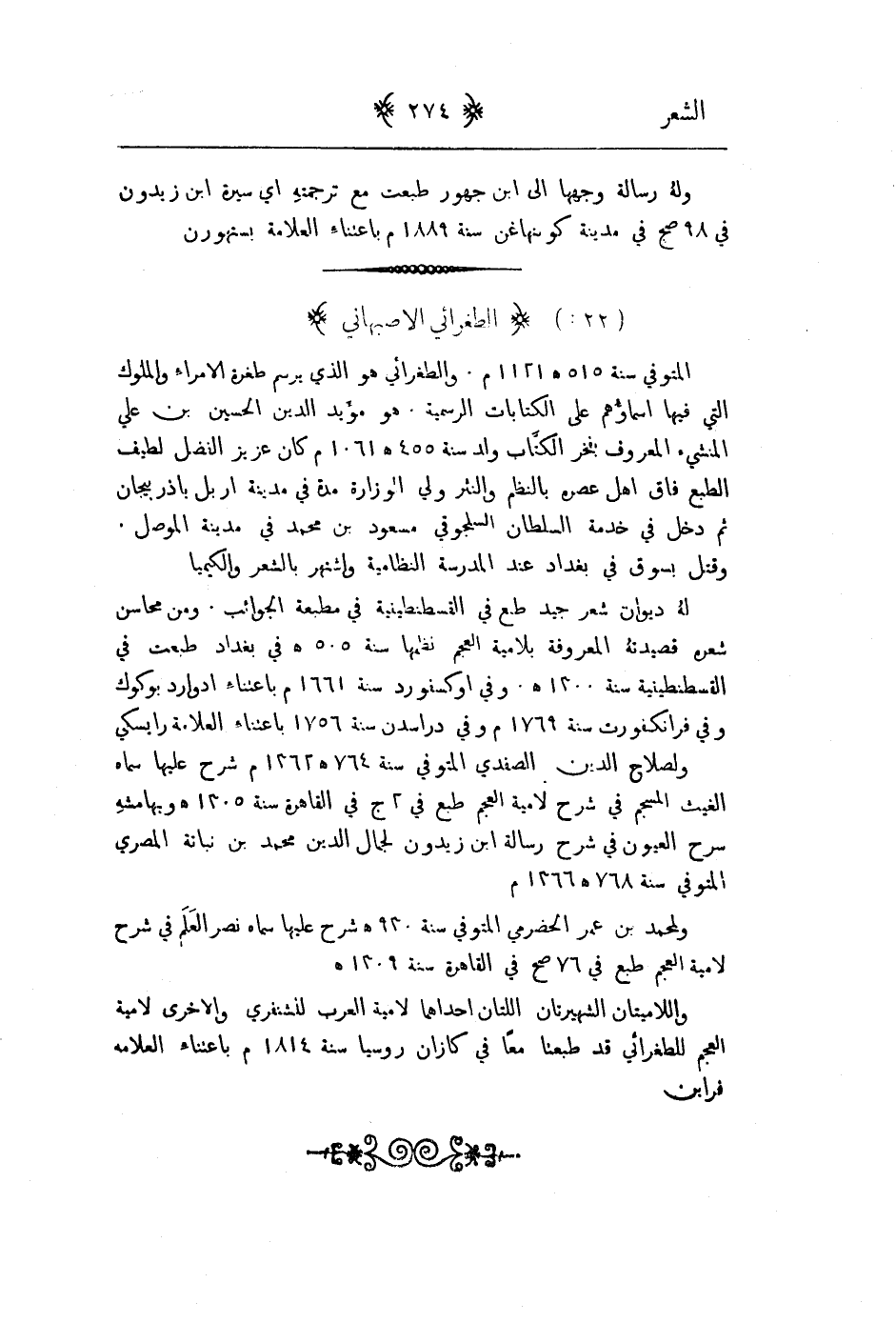 واللاميتان الشهيرتان اللتان احداهما لامية العرب للشن قري والاخرى لامية العجم للطغرائي قد طبعتا معاً في كازان روسيا سنة 1814م باعتناء العلامة فرأين.