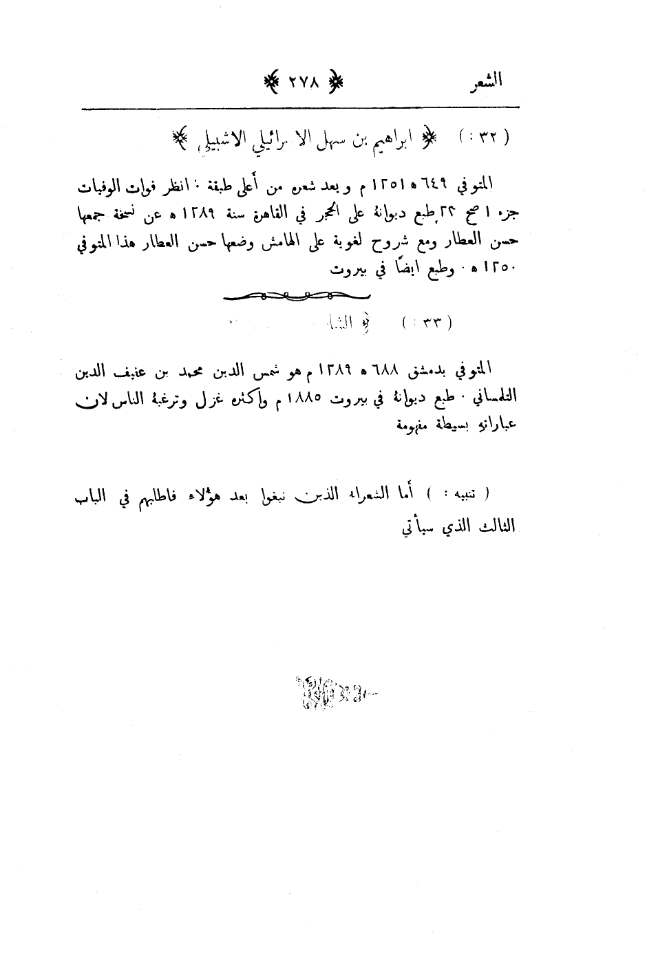 المتوفى بدمشق 688هـ 1289م هو شمس الدين محمد بن عفيف الدين التلمساني. طبع ديوانه في بيروت 1885م واكثره غزل وترغبه الناس لأن عباراته بسيطة مفهومة تنبيه: اما الشعراء الذين نبغوا بعد هؤلاء فاطلبهم في الباب الثالث الذي سيأتي