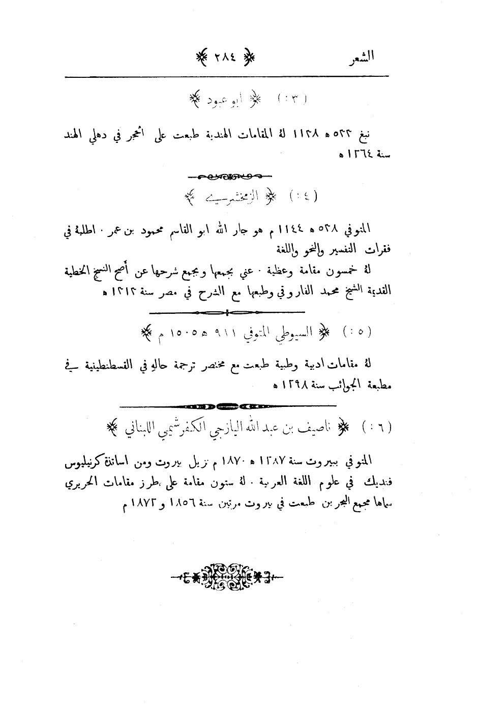 المتوفى 538هت 1144م هو جار الله ابو القاسم محمود بن عمر. اطلبه في فقرات التفسير والنحو واللغة له خمسون مقامة وعظية. عنى بجمعها وبجمع شروحها عن أصح النسخ الخطية القديمة الشيخ محمد الفاروقي وطبعها مع الشرح في مصر سنة 1313هـ