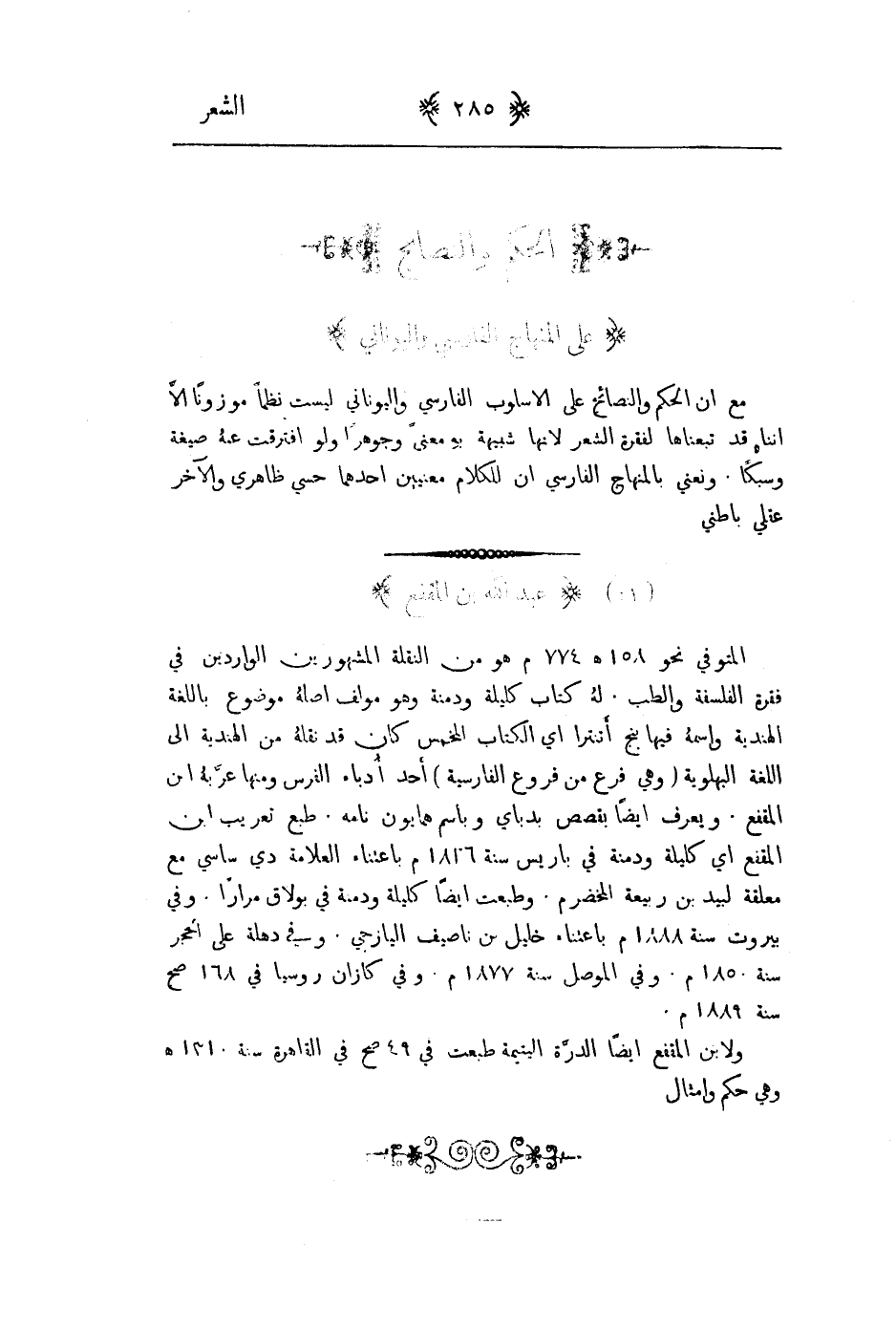 مع إن الحكم والنصائح على الاسلوب الفارسي واليوناني ليست نظماً موزوناً ألا إننا قد تبعناه الفقرة الشعر لأنها شبيهة به معنى وجوهراً ولو افترقت عنه صيغة وسبكاً. ونعني بالمنهاج الفارسي إن للكلام معنيين احدهما حسي ظاهري والآخر عقلي باطني.