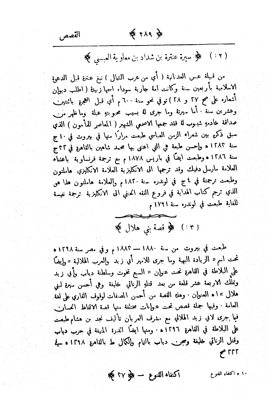 طبعت في بيروت من سنة 1880 - 1883م وفي مصر سنة 1298هـ تحت اسم " الزيادة البهية وما جرى للامير ابي زيد والعرب الهلالية " وأيضاً على البلاطة في القاهرة تحت عنوان " السبع تخوت وسلطنة دياب وابي زيد وتملك الاربعة عشر قلعة من بعد قتله الزناتي خليفة وهي احسن سيرة لبني هلال ". وهذه القصة من احسن المصنفات لوقوف القاري على لغة العامة. وفيها جملة قصص تحت عناوين مختلفة منها قصة الالفاظ الحسان فيما جرى لابي زيد الهلالي مع مشرف العربان تأليف نجد بن هشام طبعت على البلاطة في القاهرة 1296هـ. ومنها أيضاً الدرة المنيفة في حرب دياب وقتل الزناتي خليفة وسجن دياب بالتمام والكمال طبع بالقاهرة 1298هـ في 222صح.