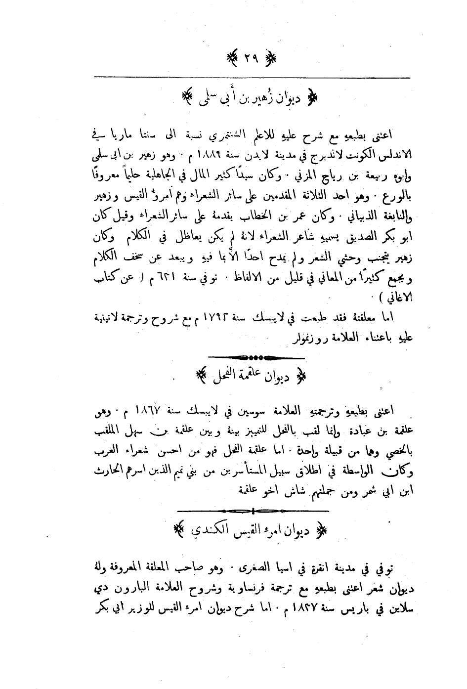 اعتنى بطبعه مع شرح عليه للعلام الشنتمري نسبة الى سانتا ماريا في الاندلس الكونت لاندبرج في مدية لايدن سنة 1889م. وهو زهير بن ابي سلمى وابه ربيعه بن رياح المزني. وكان سيدا كثير المال في الجاهلية حليما معروفا بالورع. وهو احد الثلاثة المقدمين على سائر الشعراء وهم امرؤ القيس وزهير والنابغة الذبياني. وكان عمر بن الخطاب يقدمه على سائر الشعراء وقيل كان ابو بكر الصديق يسميه شاعر الشعراء لانه لم يكن يعاظل في الكلام. وكان زهير يتجنب وحشي الشعر ولم يمدح احدا إلا بما فيه ويبعد عن سخف الكلام ويجمع كثيرا من المعاني في قليل من الالفاظ. توفي سنة 631م عن كتاب الاغاني.