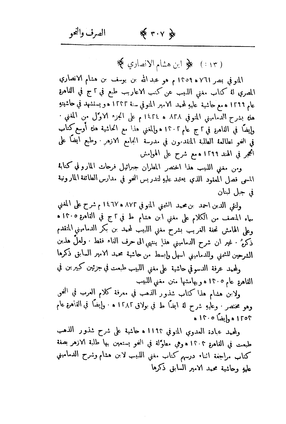 المتوفى بمصر 761هـ 1359م هو عبد الله بن سيف بن هشام الانصاري المصري له كتاب مغني اللبيب عن كتب الاعاريب طبع في 2ج في القاهرة عام 1299هـ مع حاشية عليه لمحمد الامير المتوفى سنة 1232هـ ويستشهد في حاشيته هذه بشرح الدماميني المتوفى 828هـ 1424م على الجزء الاول من المغني وأيضاً في القاهرة في 2ج عام 1302هـ والمغني هذا مع الحاشية هذه اوسع كتاب في النحو تطالعه الطلبة المتقدمون في مدرسة جامع الازهر. وطبع أيضاً على الحجر في الهند 1299هـ مع شرح على الهوامش ومن مغني اللبيب هذا اختصر المطران جبرائيل فرحات الماروني كتابه المسمى فصل العقود الذي يعتمد عليه لتدريس النحو في مدارس الطائفة المارونية في جبل لبنان ولتقي الدين أحمد بن محمد الشمني المتوفى 873هـ 1467م شرح على المغني سماه المنصف من الكلام على مغني ابن هشام طبع في 2ج في القاهرة 1305هـ وعلى الهامش تحفة الغريب بشرح مغني اللبيب لمحمد بن بكر الدماميني المتقدم ذكره. غير أن شرح الدماميني هذا ينتهي إلى حرف الفاء فقط. ولعل هذين الشرحين للشمني وللدماميني اسهل وابسط من حاشية محمد الامير السابق ذكرها ولمحمد عرفة الدسوقي حاشية على معنى اللبيب طبعت في جزئين كبيرين في القاهرة عام 1305هـ وبهامشها متن مغني اللبيب ولابن هشام هذا كتاب شذور الذهب في معرفة كلام العرب في النحو وهو مختصر وعليه شرح له أيضاً طبع في بولاق 1282هـ. وأيضاً في القاهرة عام 1253هو أيضاً 1305هـ ولمحمد عبادة العدوي المتوفى 1193هـ حاشية على شرح شذور الذهب طبعت في القاهرة 1303هـ وهي مطولة في النحو يستعين بها طلبة الازهر بصفة كتاب مراجعة اثناء درسهم كتاب مغني اللبيب لابن هشام وشرح الدمامينيي عليه وحاشية محمد الامير السبق ذكرها