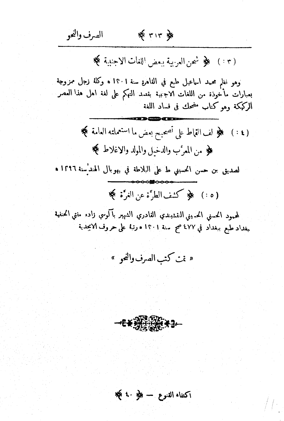 لمحمد الحسني الحسيني النقشبندي القادري الشهير بالآلوسي زاده مفتي الحنفية ببغداد طبع ببغداد في 477صح سنة 1301هـ رتبه على حروف الابجدية " تمت كتب الصرف والنحو "