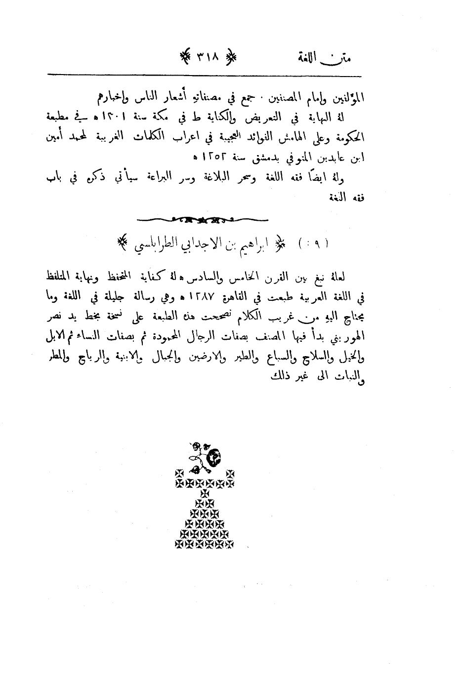 المؤلفين وإمام المصنفين. جمع في مصنفاته أشعار الناس واخبارهم له النهاية في التعريض والكتابة طبع في مكة سنة 1301هت في مطبعة الحكومة وعلى الهامش الفوائد العجيبة في اعراب الكلمات الغريبة لمحمد امين ابن عابدين المتوفى بدمشق سنة 1252هـ وله أيضاً فقه اللغة وسحر البلاغة وسر البراعة سيأتي ذكره في باب فقه اللغة