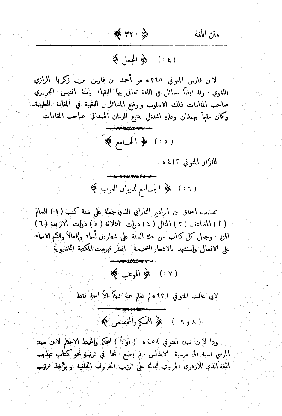 لابن فارس المتوفى 395هـ هو أحمد بن فارس بن زكريا الرازي اللغوي. وله أيضاً مسائل في اللغة تعانى بها الفقهاء ومنه الحريري صاحب المقامات ذلك الاساوبو وضع المسائل الفقهية في المقامة الطبية وكان مقيماً بهمذان وعليه اشتغل بديع الزمان الهمذاني صاحب المقامات
