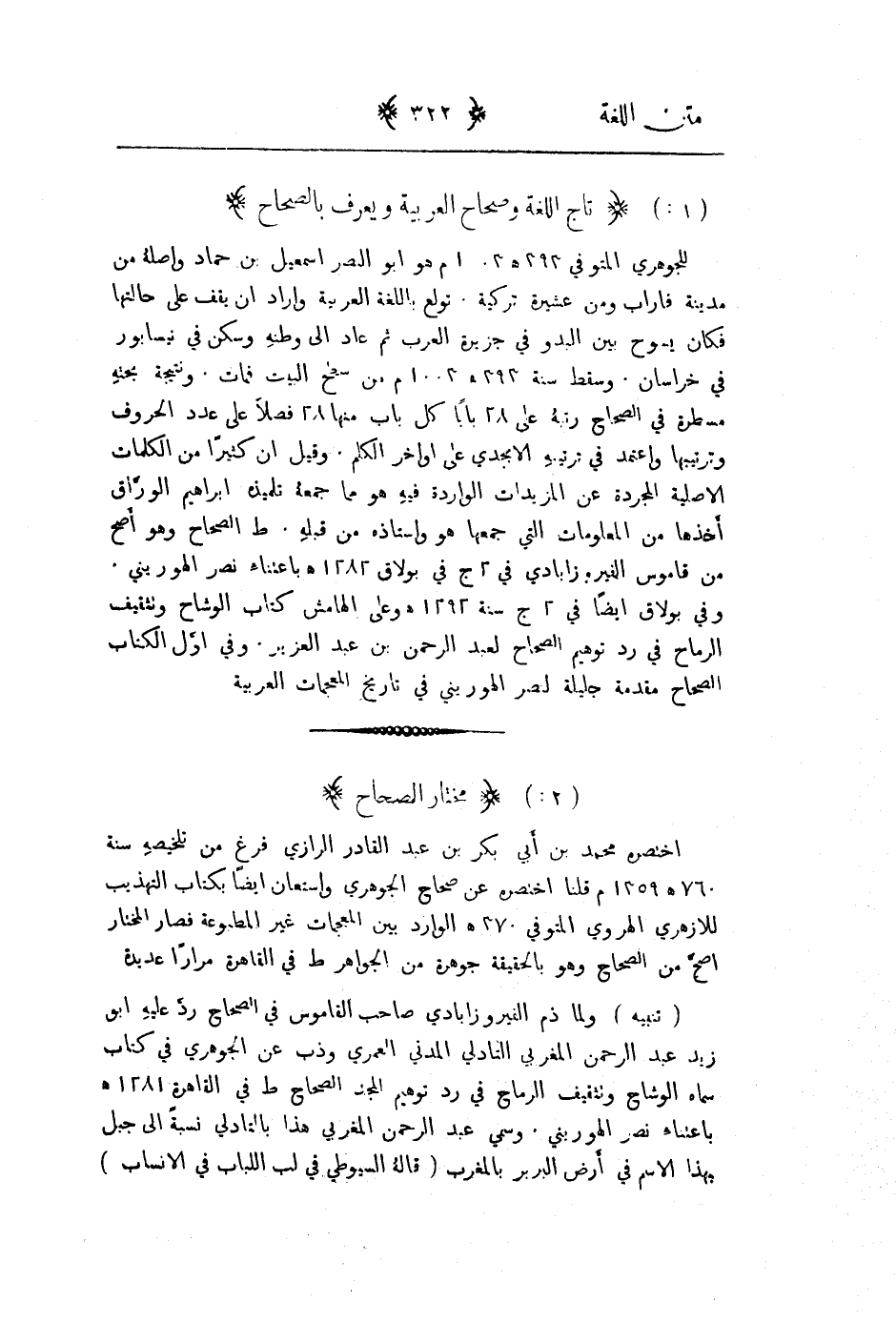 للجوهري المتوفى 393هـ 1003م هو البو النصر اسماعيل بن حماد واصله من مدينة فاراب ومن عشيرة تركية. تولع باللغة العربية واراد أن يقف على حالته فكان يسوح بين البدو في جزيرة العرب ثم عاد إلى وطنه وسكن في نيسابور في خراسان. وسقط سنة 393هت 1003م من سطح بيته فمات. ونتيجة بحثه مسطرة في الصحاح رتبه على 28 فصلاً على عدد الروف وترتيبها واعتمد في ترتيبه الابجدي على اواخر الكلم. وقيل إن كثراً من الكلمات الاصلية المجردة عن المزيدات الواردة فيه هو مما جمعه تلميذه ابراهيم الوراق أخذها من المعلومات التي جمعها هو واستاذه من قبله. طبع الصحاح وهو أصح من قاموس الفيروزابادي في 2ج في بولاق 1282هـ باعتناء نصر الهرويني وفي بولاق أيضاً في 2ج سنة 1292هـ وعلى الهامش كتاب الوشاح وتثقيف الرماح في رد توهيم الصحاح لعبد الرحمن بن عبد العزيز. وفي اول الكتاب الصحاح مقدمة جليلة انصر الهرويني في تاريخ المعجمات العربية