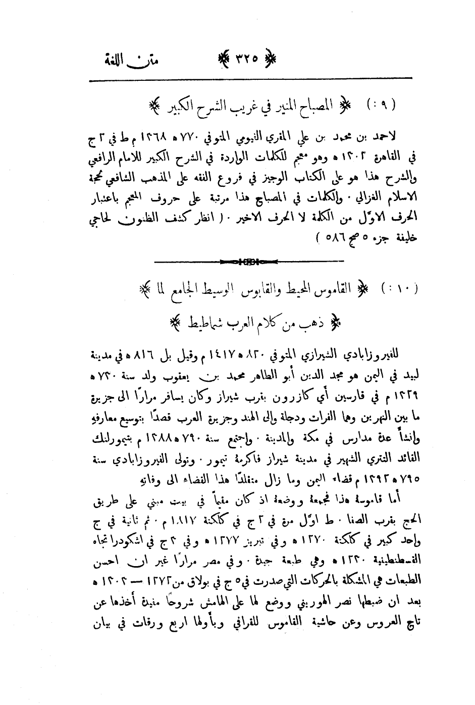 لأحمد بن محمد بن علي المقري الفيومي المتوفى 770هـ 1368م طبع في 2ج في القاهرة 1302هـ وهو معجم للكلمات الواردة في الشرح الكبير للامام الرافعي والشرح هذا هو على كتاب الوجيز في فروع الفقه على المذهب الشافعي لحجة الاسلام الغزالي. والكلمات في المصباح هذا مرتبة على حروف المعجم باعتبار الحرف الاول من الكلمة لا الحرف الاخير. " انظر كشف الظنون لحلجي خليفة جزء 5 صح 586 "