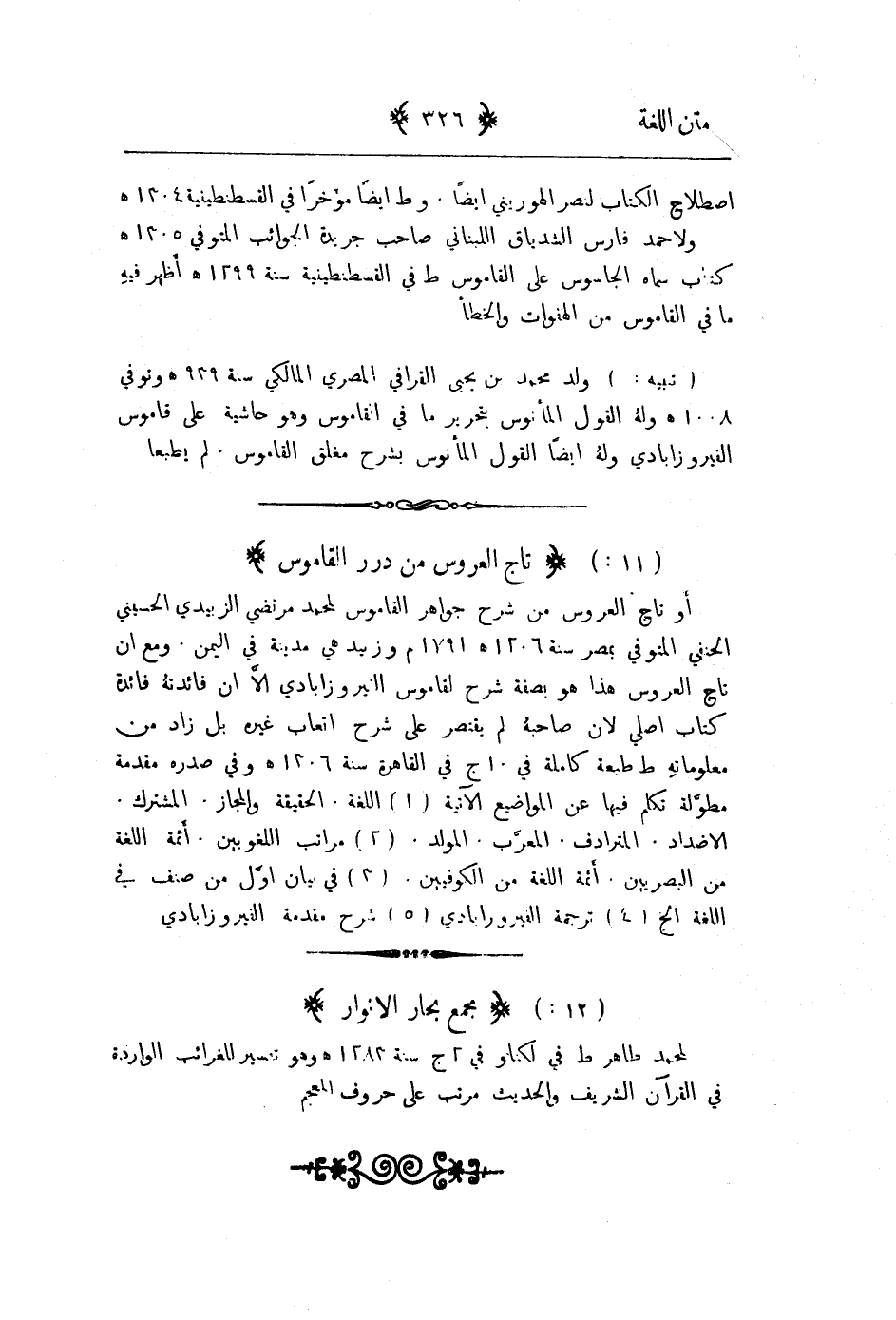 أو تاج العروس من شرح جواهر القاموس لمحمد مرتضى الزبيدي الحسيني الحنفي المتوفى بمصر سنة 1206هـ 1791م وزبيد هي مدينة في اليمن. ومع إن تاج العروس هو بصفة شرح لقاموس الفيروزابادي الا إن فائدته فائدة كتاب اصلي لأن صاحبه لم يقتصر على شرح اتعاب غيره بل زاد من معلوماته طبع طبعة كاملة في 10ج في القاهرة سنة 1306هـ وفي صدره مقدمة مطولة تكلم فيها عن المواضيع الآتية: 1 - اللغة. الحقيقة والمجاز. المشترك. الاضداد. المترادف. المعرب. المولد. 2 - مراتب اللغويين. أئمة اللغة من البصريين. أئمة اللغة من الكوفيين3 - في بيان اول من صنف في اللغة 4 - ترجمة الفيروزابادي 5 - سرح مقدمة الفيروزابادي
