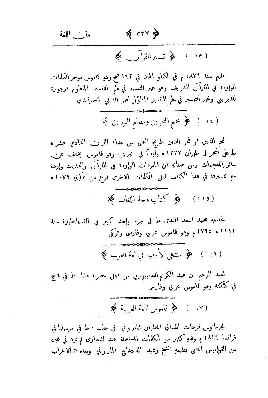 طبع سنة 1879م في لكناو الهند في 192صح وهو قاموس موجز للكلمات الواردة في القرآن الشريف وهو غير التيسير في علم التفسير المنظوم ارجوزة للديريني وعير التيسير في علم التفسير المطول لعمر النسفي السمرقندي