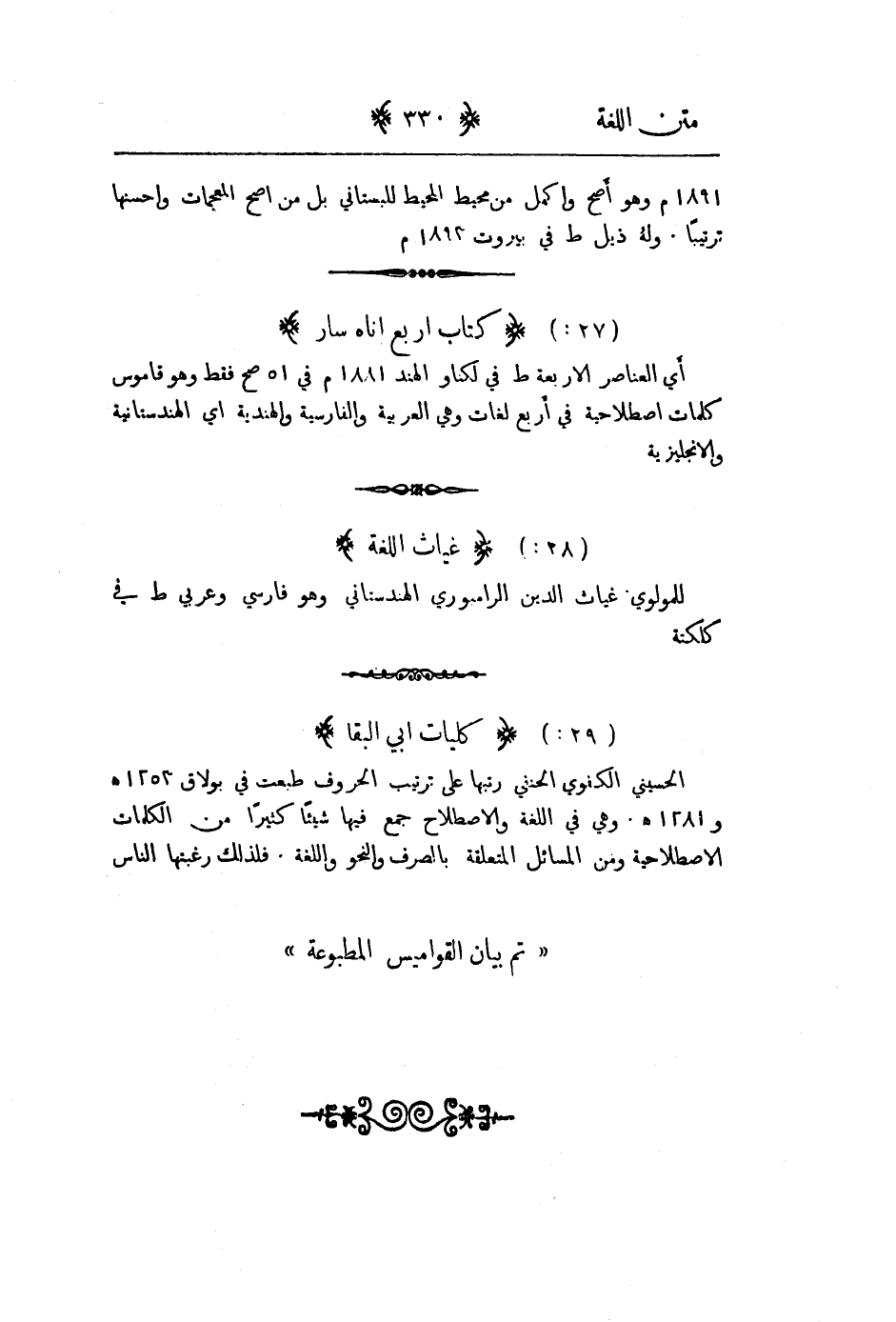 1891م وهو أصح واكمل من محيط المحيط للبستاني بل من اصح المعجمات واحسنها ترتيباً. وله ذيل طبع في بيروت 1893