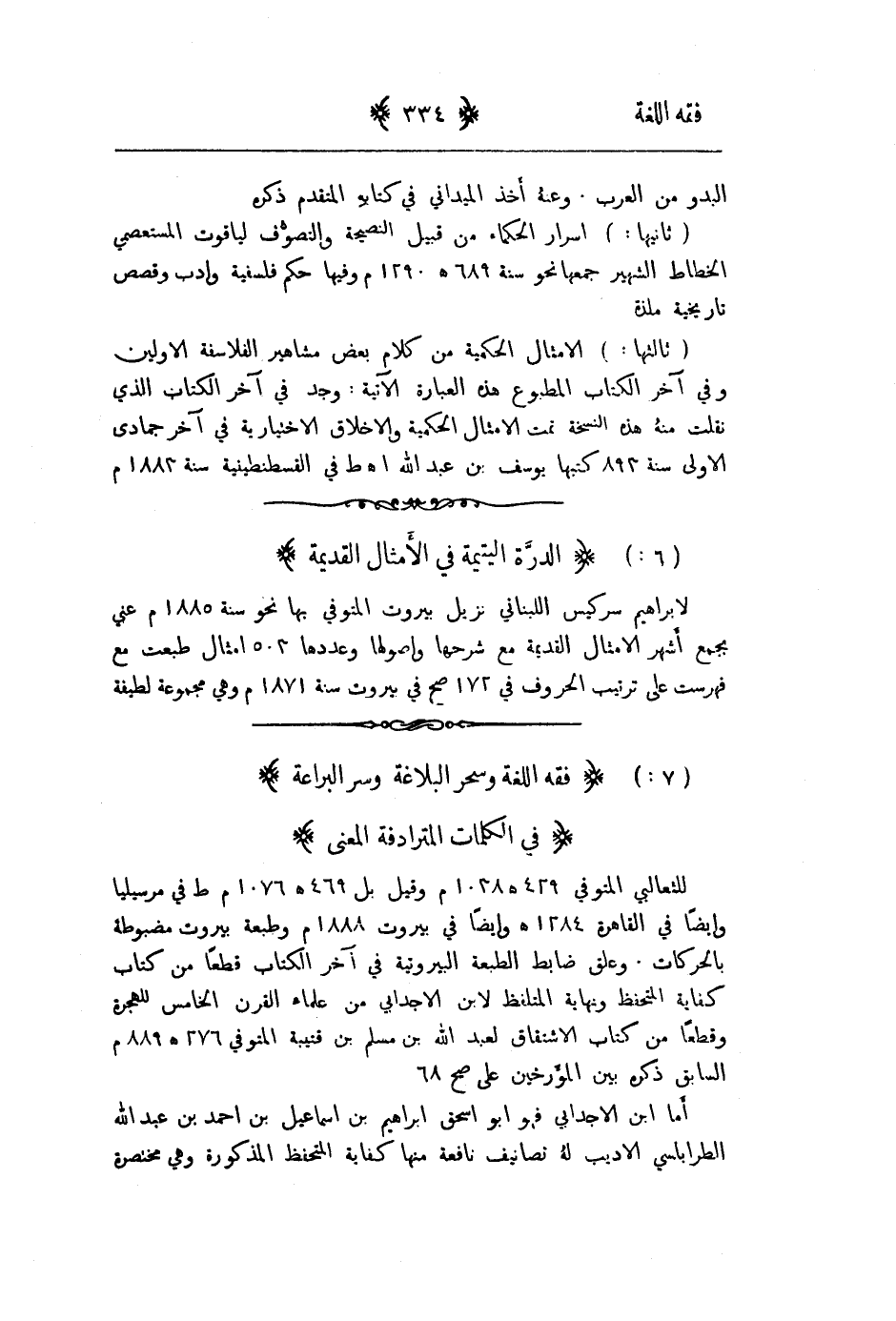 البدو من العرب وعنه أخذ الميداني في كتابه المتقدم ذكره ثانيها: اسرار الحكماء من سبيل النصيحة والتصوف لياقوت المستعصمي الخطاط الشهير جمعها نحو سنة 689هـ 1290م وفيها حكم فلسفية والدب وقصص تاريخية ملذة ثالثها: الامثال الحكيمة من كلام بعض مشاهير الفلسفة الاولين وفي لآخر الكتاب المطبوع هذا العبارة الآتية: وجد في آخر الكتاب الذي نقلت منه هذه النسخة تمت الامثال الحكيمة والاخلاق الاختيارية في اخر جمادي الاولى سنة 893هت كتبها يوسف بن عبد الله طبع في القسطنطينية سنة 1883م