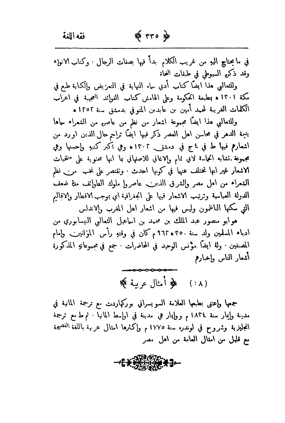 في ما يحتاج اليه غريب الكلام بدأ فيها بصفات الرجال. وكتاب الانواء وقد ذكره السيوطي في طبقات النجاة وللثعالبي هذا أيضاً كتاب أدبي سماه النهاية في التعريض والكناية طبع في مكة 1301هـ بمطبعة الحكومة وعلى الهامش كتاب الفوائد العجيبة في اعراب الكلمات الغريبة لمحمد أمين بن عابدين المتوفى بدمشق سنة 1252هـ وللثعالبي هذا أيضاً مجموعة اشعار من نظم من عاصره من الشعراء سماها يتيمة الدهر في محاسن اهل العصر ذكر فيها أيضاً تراجم حال الذين اورد من اشعارهم فيها طبع في 4ج في دمشق 1302هـ وهي اكبر كتبه واحسنها وهي مجموعة تشابه الحماسة لابي تمام والاغاني للاصفهاني بما إنها محتوية على منتخبات الاشعار غير أنها تختلف عنها في كونها احدث. وتقتصر على نخب من نظم الشعراء من اهل مصر والشرق الذين عاصروا ملوك الطوائف مدة ضعف الدولة العباسية وترتيب الاشعار فيها على الجغرافية أي بموجب الاقطار والاقاليم التي سكنها الناظمون وليس فيها من اشعار اهل المغرب والاندلس.