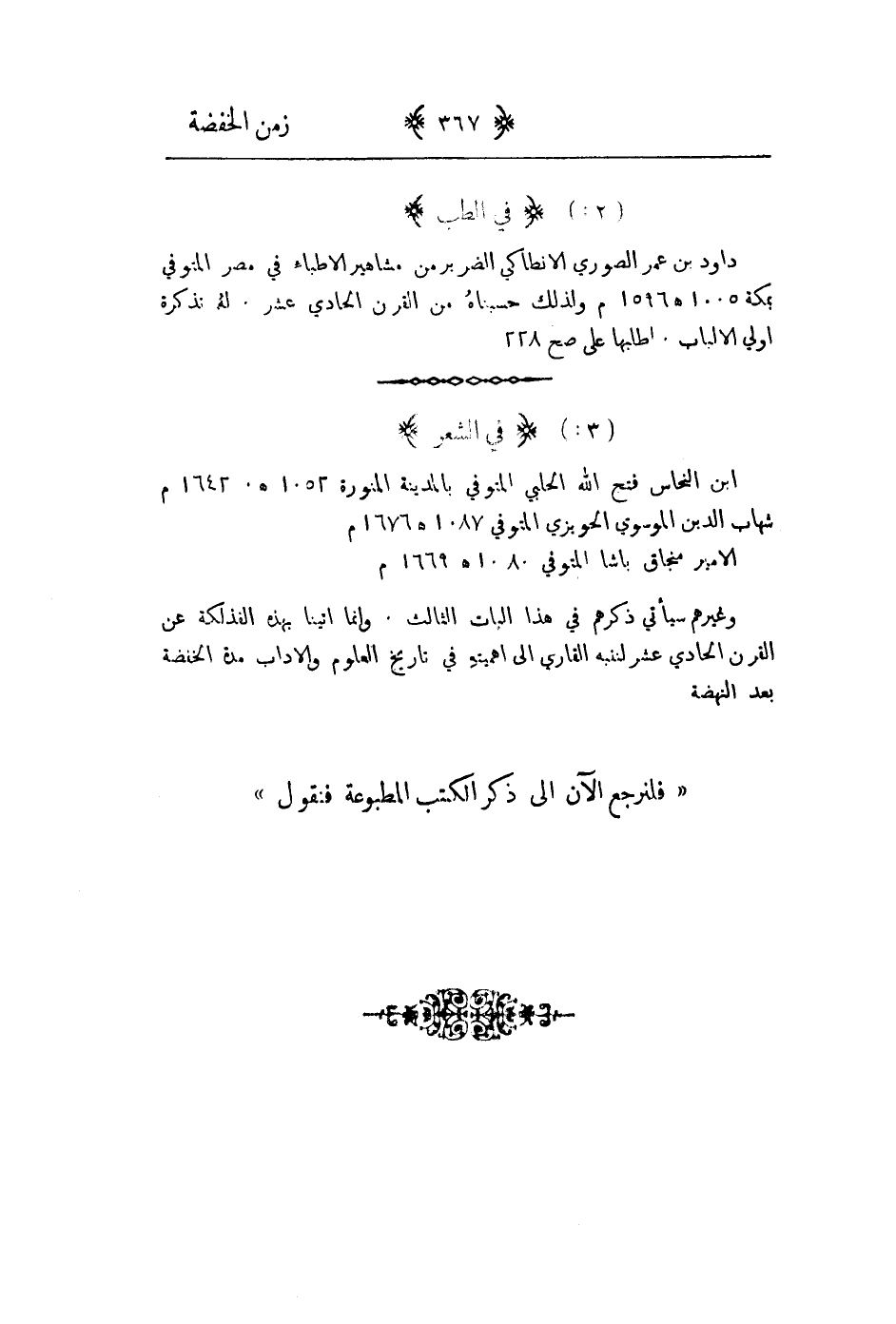 وغيرهم سيأتي ذكرهم في هذا الباب الثالث. وإنما اتينا بهذه الفذلكة عن القرن الحادي عشر لننبه القاري إلى اهميته في تاريخ العلوم والآداب مدة الخفضة بعد النهضة " فلنرجع الان إلى ذكر الكتب المطبوعة فنقول "