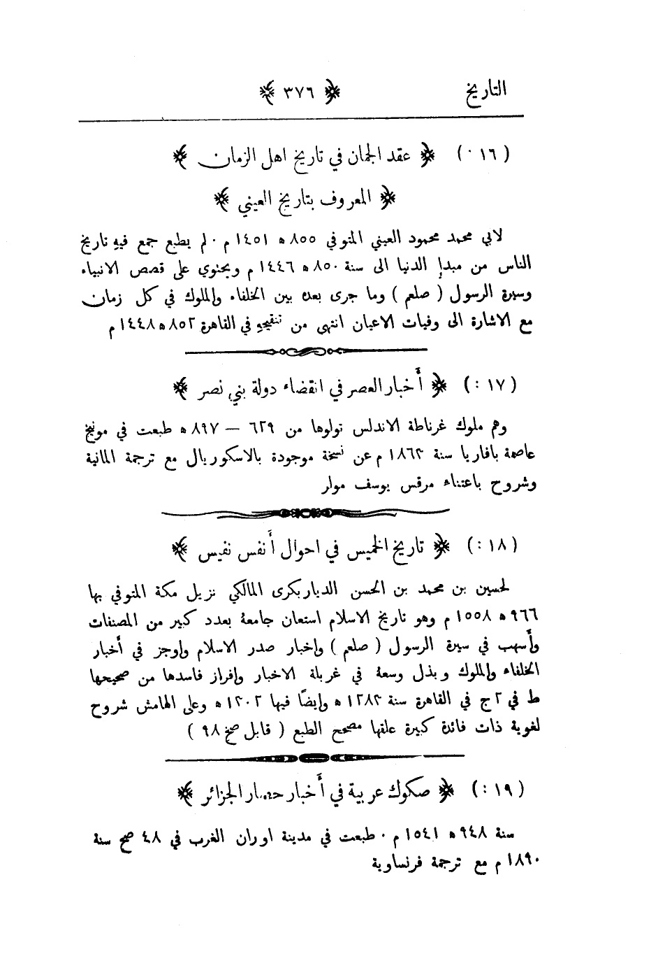 وهم ملوك غرناطة الاندلس تولوها من 629 - 897هـ طبعت في ميونخ عاصمة بافاريا سنة 1863م عن نسخة موجودة بالاسكوربال مع ترجمة المانية وشروح باعتناء مرقس يوسف مولر