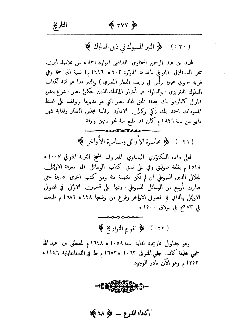 وهو جداول تاريخية لغاية سنة 1058هـ 1648م لمصطفى بن عبد الله حجي خليفة كاتب جلبي المتوفى 1063هـ 1653م طبع في القسطنطينية 1146هـ 1733م وهو الان نادر الوجود