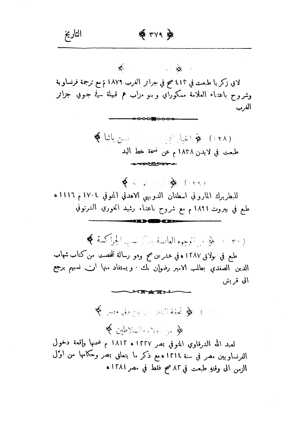 لعبد الله الشرقاوي المتوفى بمصر 1227هـ 1812م ضمنها واقعة دخول الفرنسيين مصر في سنة 1214هـ مع ذكر ما يتعلق بمصر وحكامها من اول الزمن إلى وقته طبعت في 82صح فقط في مصر 1281هـ