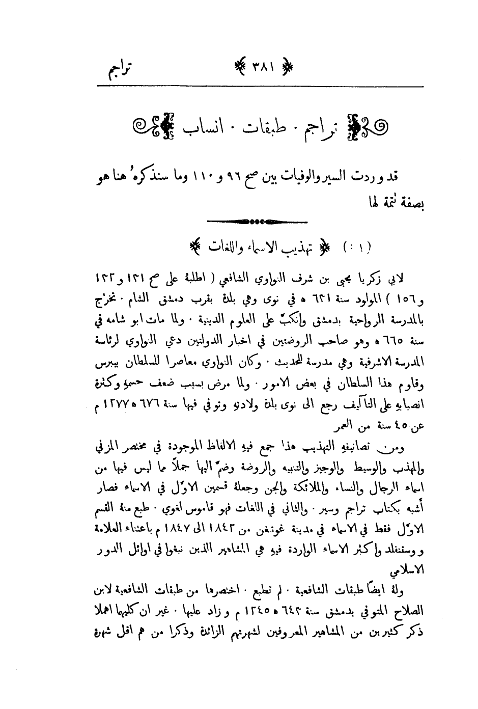 لابي زكريا يحيى بن شرف النواوي الشافعي المولود سنة 631هـ في نوى وهي بلدة بقرب دمشق الشام. تخرج بالمدرسة الرواحية بدمشق وانكب على العلوم الدينية. ولما مات ابو شامة في سنة 665هـ وهو صاحب الروضتين في اخبار الدولتين دعي النواوي لرئاسة المدرسة الاشرفية وهي مدرسة للحديث. وكان النواوي معاصراً للسلطان ببرس وقاوم هذا السلطان في بعض الامور. ولما مرض بسبب ضعف جسمه وكثرة انصبابه على التآليف رجع إلى نوى بلدة ولادته وتوفي فيها سنة 676هـ 1277م عن 45 سنة من العمر ومن تصانيفه التهذيب هذا جمع فيه الالفاظ الموجودة في مختصر المزني والمهذب والوسيط والوجيز والتنبيه والروضة وضم اليها جملاً مما ايس فيها من اسماء الرجال والنساء والملائكة والجن وجعله قسمين الاول في الاسماء فصار اشبه بكتاب تراجم وسير. والثاني في اللغات فهو قاموس لغوي. طبع منه القسم الاول فقط في الاسماء في مدينة غوتنغن من 1842 إلى 1847م باعتناء العلامة وستنفلد واكثر الاسماء الواردة فيه هي المشاهير الذين نبغوا في اوائل الدور الاسلامي وله ايضا طبقات الشافعية. لم تطبع. اختصرها من طبقات الشافعية لابن الصلاح المتوفى بدمشق سنة 643هـ 1245م وزاد عليها. غير أن كليهما اهملا ذكر كثيرين من المشاهير المعروفين بشهرتهم الزائدة وذكرا من هم اقل شهرة