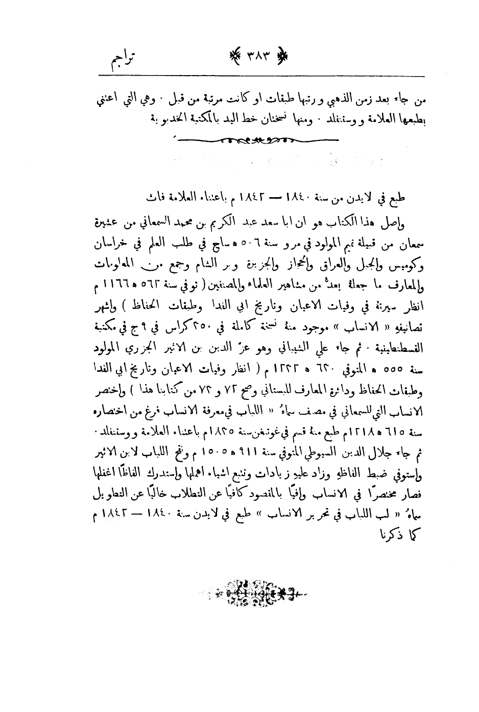 واصل هذا الكتاب هو أن ابا سعد عبد الكريم بن محمد السمعاني من عشيرة سمعان من قبيلة تميم المولود في مرو سنة 506هـ ساح في طلب العلم في خراسان وكومس والجبل والعراق والحجاز والجزيرة وبر الشام وجمع من المعلومات والمعارف ما جعله يعد من مشاهير العلماء والمصنفين " توفي سنة 562هـ 1166م انظر سيرته في وفيات الاعيان وتاريخ ابي الفدا وطبقات الحفاظ " واشهر تصانيفه " الانساب " موجودة منه نسخة كاملة في 350كراس في 9ج في مكتبة القسطنطينية. ثم جاء إلى الشيباني وهو عز الدين بن الاثير الجزري المولود سنة 555هـ المتوفى 630هـ 1232م " انظر وفيات الاعيان وتاريخ ابي الفدا وطبقات الحفاظ ودائرة المعارف للبستاني " واختصر الانساب التي للسمعاني في مصنف سماه " اللباب في معرفة الانساب فرغ من اختصاره سنة 615هـ 1218م طبع منه قسم في غوتنغن سنة 1835م باعتناء العلامة ووستنفلد. ثم جاء جلال الدين السيوطي المتوفى سنة 911هـ 1505م ونقح اللباب لابن الاثير واتوفى ضبط الفاظه وزاد عليه زيادات وتتبع اشياء اهملها واستدرك الفاظاً اخفلها فصار مختصراً في الانساب وافياً بالمقصود كافياً عن التطلاب خالياً عن التطويل سماه " لب اللباب في تحرير الانساب " طبع في لايدن سنة 1840 - 1843م كما ذكرنا