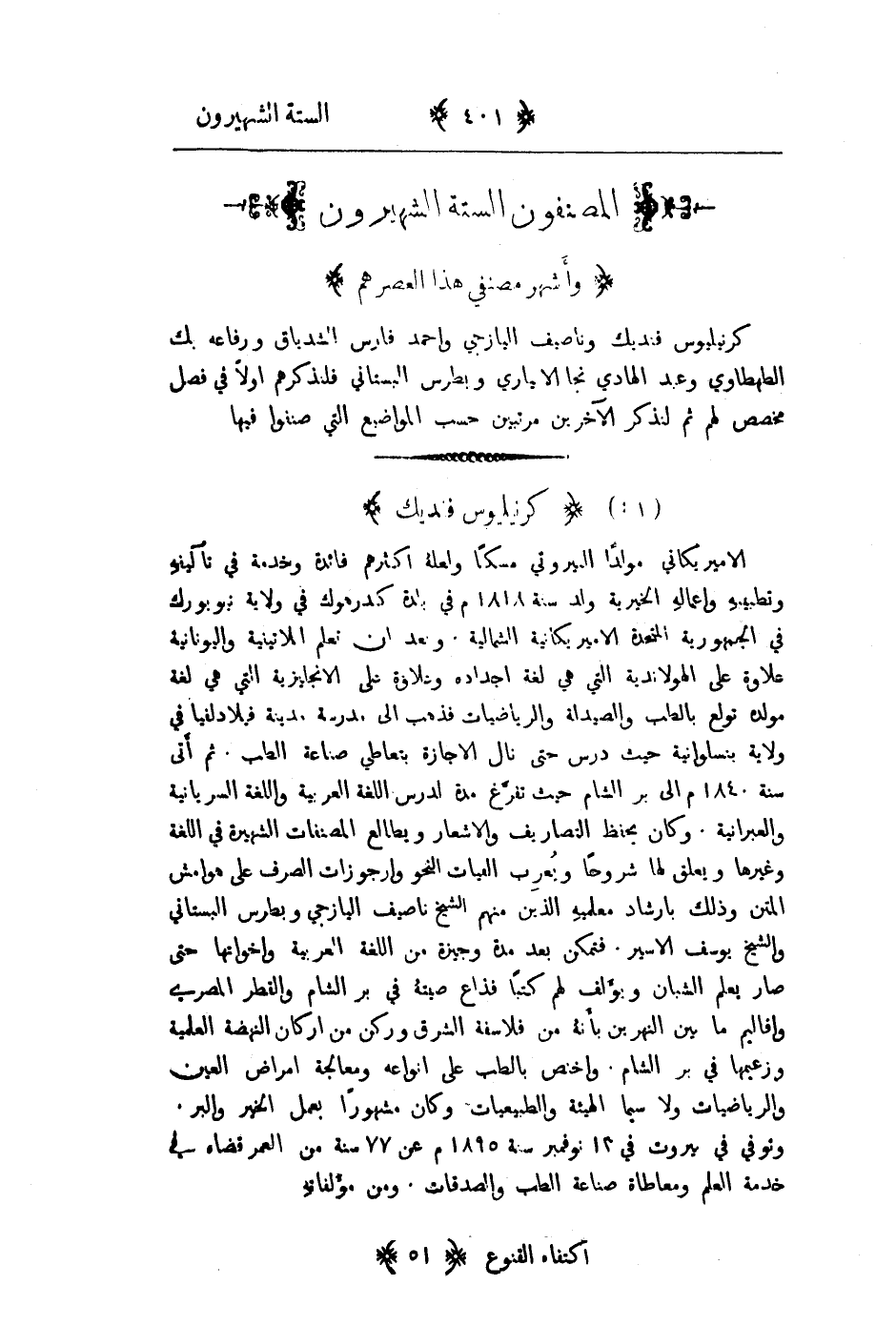 الامريكي مولداً البيروتي مسكناً ولعله اكثرهم فائدة وخدمة في تآليفه وتطبيبه واعماله الخيرية ولد سنة 1818م في بلدة كندرهوك في ولاية نيويورك في الجمهورية المتحدة الامريكية الشمالية. وبعد أن تعلم اللاتينية واليونانية علاوة على الهولندية التي هي لغة اجداده وعلاوة على الانجليزية التي هي لغة مولده تولع بالطب والصيدلة والرياضيات فذهب إلى مدرسة مدينة فيلادلفيا في ولاية بنسلفانيا حيث درس حتى نال الاجازة بتعاطي صناعة الطب. ثم أتى سنة 1840م إلى بر الشام حيث تفرغ مدة لدرس اللغة العربية واللغة السريانية والعبرانية. وكان يحفظ التصاريف والاشعار ويطالع المصنفات الشهيرة في اللغة وغيرها ويعلق لها شروحاً ويُعرِب الفيات النحو وارجوزات الصرف على هوامش المتن وذلك بارشاد معلميه الذين منهم الشيخ ناصيف اليازجي وبطرس البستاني والشيخ يوسف الاسير. فتمكن بعد مدة وجيزة من اللغة العربية واخواتها حتى صار يعلم الشبان ويؤلف لهم كتباً فذاع صيته في بر الشام والقطر المصري واقاليم ما بين النهرين بأنه من فلاسفة الشرق وركن من اركان النهضة العلمية وزعيمها في بر الشام. واختص بالطب على انواعه ومعالجته امراض العين والرياضيات ولا سيما الهيئة والطبيعيات وكان مشهوراً بعمل الخير والبر. وتوفى في بيروت في 13 نوفمبر سنة 1895م عن 77 سنة من العمر قضاها في خدمة العلم ومعاطاة صناعة الطب والصدقات. ومن مؤلفاته