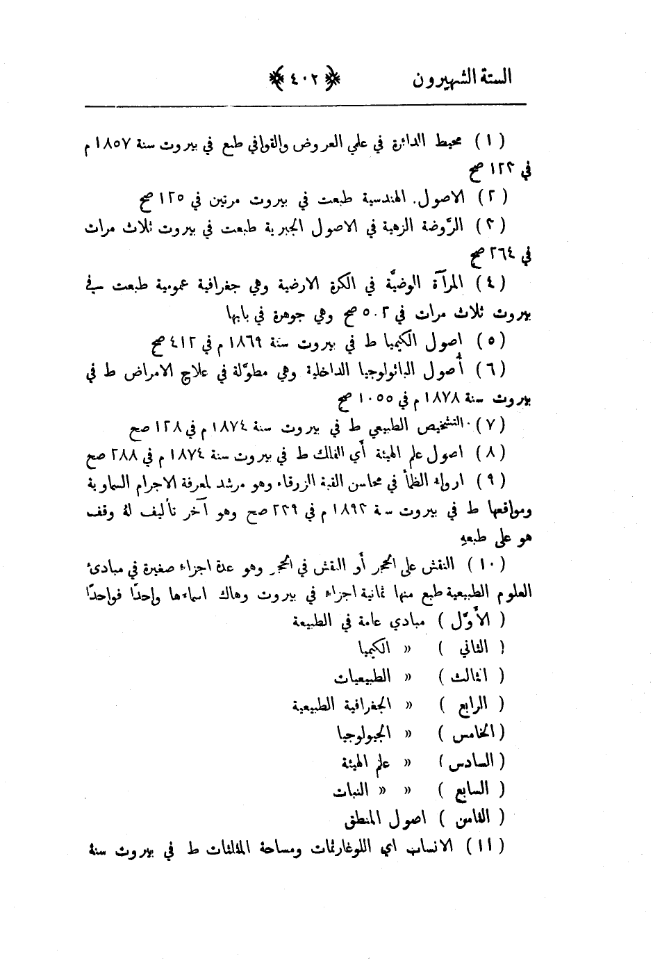 1 - محيط الدائرة في علمي العروض والقوافي طبع في بيروت سنة 1857م في 123صح 2 - الاصول الهندسية طبعت في بيروت مرتين في 125صح 3 - الروضة الذهبية في الاصول الجبرية طبعت في بيروت ثلاث مرات في 264صح 4 - المرآة الوضيَّة في الكرة الارضية وهي جغرافية عمومية طبعت في بيروت ثلاث مرات في 502صح وهي جوهرة في بابها 5 - اصول الكيمياء طبعت في بيروت سنة 1869م في 412صح 6 - اصول الباثولوجيا الداخلية وهي مطولة في علاج الامراض طبع في بيروت سنة 1878م في 1055صح 7 - التشخيص الطبيعي طبع في بيروت سنة 1874م في 128صح 8 - اصول علم الهيئة أي الفلك طبع في بيروت سنة 1874م في 288صح 9 - ارواء الظمأ في محاسن القبة الزرقاء وهو مرشد لمعرفة الاجرام السماوية ومواقعها طبع في بيروت سنة 1893م في 239صح وهو اخر تأليف له وقف هو على طبعه 10 - النقش على الحجر او النقش في الحجر وهو عدة اجزاء صغيرة في مبادئ العلوم الطبيعية طبع منها ثمانية اجزاء في بيروت وهاك اسماءها واحداً فواحداً الاول: مبادئ عامة في الطبيعة الثاني: مبادئ الكيمياء الثالث: مبادئ الطبيعيات الرابع: مبادئ الجغرافية الطبيعية الخامس: مبادئ الجيولوجيا السادس: مبادئ علم الهيئة السابع: مبادئ علم النبات الثامن: اصول المنطق 11 - الانساب أي اللوغاريتمات ومساحة المثلثات طبع في بيروت سنة