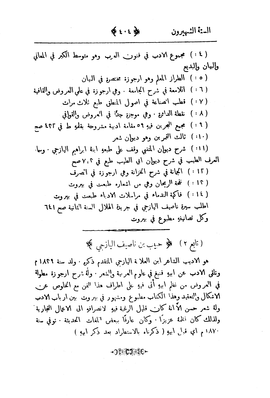 مجموع الادب في فنون العرب وهو متوسط الكبر في المعاني والبيان والبديع 5: الطراز المعلم وهو ارجوزة مختصرة في البيان 6: اللامعة في شرح الجامعة. وهي ارجوزة في علمي العروض والقافية 7: قطب الصناعة في اصول المنطق طبع ثلاث مرات 8: نقطة الدائرة. وهي موجزة جداً في العروض والقوافي 9: مجمع البحرين فيه 59 مقامة ادبية مشروحة بقلمه طبعت في 432صح 10: ثالث القمرين وهو ديوان شعر 11: شرح ديوان المتنبي وقف على طبعه ابنه ابراهيم اليازجي. وسماه العرف الطيب في شرح ديوان ابي الطيب طبع في 703صح 12: الجمانة في شرح الخزانة وهي ارجوزة في الصرف 13: نفحة الريحان وهي من اشعاره طبعت في بيروت 14: فاكهة الندماء في مراسلات الادباء طبعت في بيروت اطلب سيرة ناصيف اليازجي في جريدة الهلال السنة الثانية صح 641 وكل تصانيفه مطبوع في بيروت