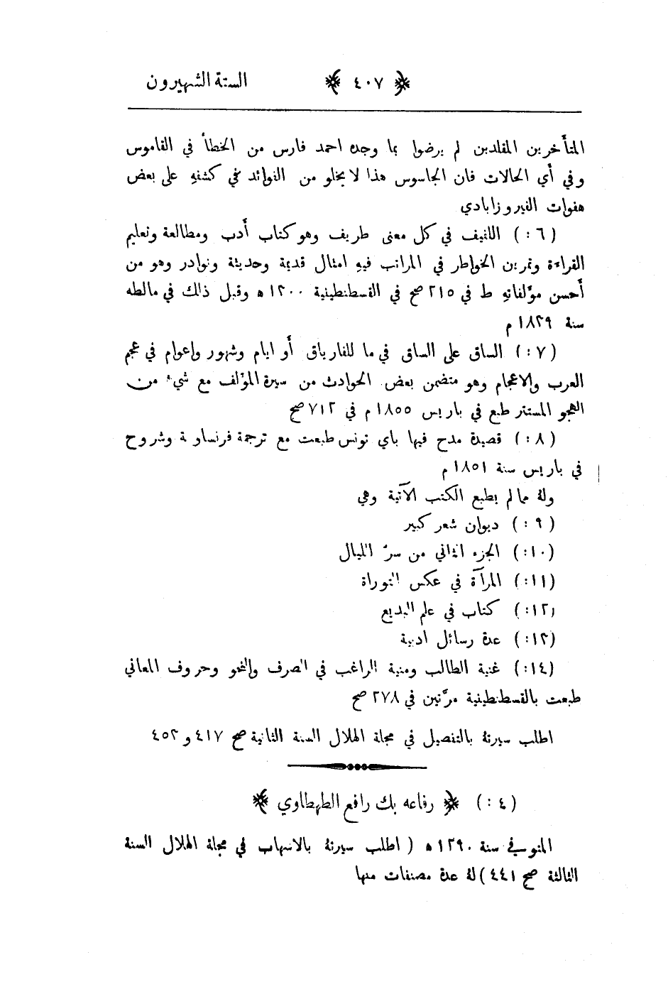 المتأخرين المقلدين لم يرضوا بما وجده أحمد فارس من الخطأ في القاموس وفي أي الحالات فإن الجاسوس هذا لا يخلو من الفوائد في كشفه على بعض هفوات الفيروزابادي 6: اللفيف في كل معنى طريف وهو كتاب ادب ومطالعة وتعليم القراءة وتمرين الخواطر في المراتب فيه امثال قديمة وحديثة ونوادر وهو من احسن مؤلفاته طبع في 215صح في القسطنطينية 1300هـ وقبل ذلك في مالطة سنة 1839م 7: الساق على الساق في ما للفارياق او ايام وشهور واعوام في عجم العرب والاعجام وهو متضمن بعض الحوادث من سيرة المؤلف مع شيء من الهجو المستتر طبع في باريس 1855م في 712صح 8: قصيدة مدح فيها باي تونس طبعت مع ترجمة فرنسية وشروح في باريس سنة 1851م وله مما لم يطبع الكتب الآتية وهي: 9: ديوان شعر كبير 10: الجزء الثاني من سر الليالي 11: المرآة في عكس التوراة 12: كتاب في علم البديع 13: عدة رسائل ادبية 14: غنية الطالب ومنية الراغب في الصرف والنحو وحروف المعاني طبعت في القسطنطينية مرتين في 278صح اطلب سيرته بالتفصيل في مجلة الهلال السنة الثانية صح 417 و 453