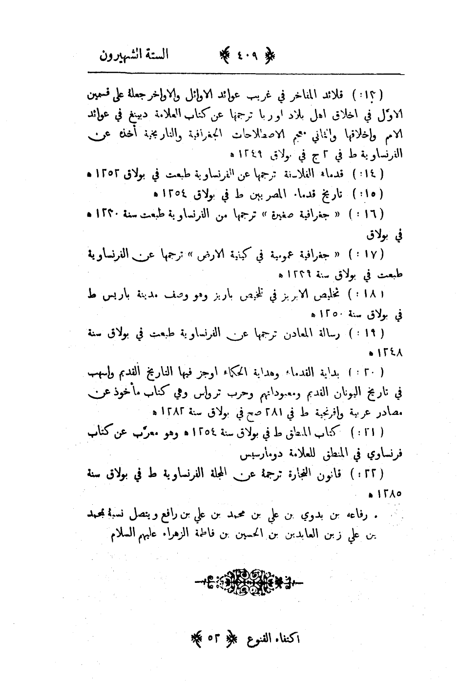13 - قلائد المفاخر في غريب عوائد الاوائل والاواخر جعله على قسمين الاول في اخلاق اهل بلاد اوربا ترجمها عن كتاب العلامة دبينغ في عوائد الامم واخلاقها والثاني معجم الاصطلاحات الجغرافية والتاريخية أخذه عن الفرنسية طبع في 2ج في بولاق 1249هـ 14 - قدماء الفلاسفة ترجمها عن الفرنسية طبعت في بولاق 1254هـ 15 - تاريخ قدماء المصريين طبع في بولاق 1254هـ 16 - " جغرافية صغيرة " ترجمها من الفرنسية طبعت سنة 1230هـ في بولاق 17 - " جغرافية عمومية في كيفية الارض " ترجمها عن الفرنسية طبعت في بولاق سنة 1239هـ 18 - تخليص الابريز في تلخيص باريز وهو وصف مدينة باريس طبع في بولاق سنة 1250هـ 19 - رسالة المعادن ترجمها عن الفرنسية طبعت في بولاق سنة 1248هـ 20 - بداية القدماء وهداية الحكماء اوجز فيها التاريخ القديم واسهب في تاريخ اليونان القديم ومعبوداتهم وحرب ترواس وهي كتاب مأخوذ عن مصادر عربية وافرنجية طبع في 281صح قي بولاق سنة 1282هـ 21 - كتاب المنطق طبع في بولاق سنة 1254هـ وهو معرب عن كتاب فرنسي في المنطق للعلامة دومارسيس 22 - قانون التجارة ترجمه عن المجلة الفرنسية طبع في بولاق سنة 1285هـ هو رفاعة بن بدوي بن علي بن محمد بن علي بن رافع ويتصل نسبه بمحمد الباقر بن علي زين العابدين بن الحسين بن فاطمة الزهراء عليهم السلام