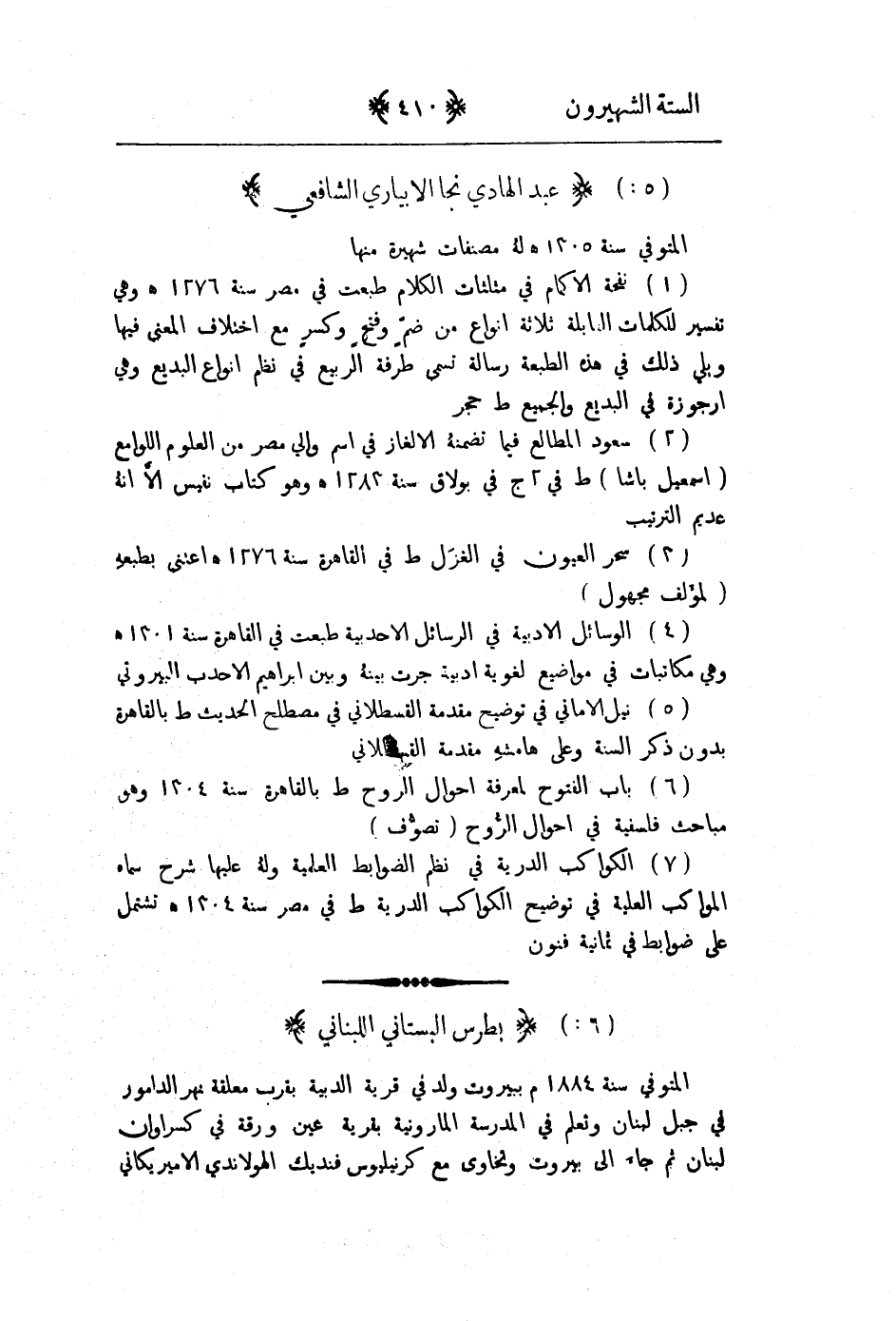 المتوفى سنة 1305هـ له مصنفات شهيرة منها 1 - نفحة الاكمام في مثلثات الكلام طبعت في مصر سنة 1276هـ وهي تفسير للكلمات النابلة ثلاثة انواع من ضم وفتح وكسر مع اختلاف المعنى فيها ويلي ذلك في هذه الطبعة رسالة تسمى طرفة الربيع في نظم انواع البديع وهي ارجوزة في البديع والجميع طبع حجر 2 - سعود المطالع فيما تضمنه الالغاز في اسم والي مصر من العلوم اللوامع " اسماعيل باشا " طبع في 2ج في بولاق سنة 1283هـ وهو كتاب نفيس إلا أنه عديم الترتيب 3 - سحر العيون في الغزل طبع في القاهرة سنة 1276هـ اعتنى بطبعه " لمؤلف مجهول " 4 - الوسائل الادبية في الرسائل الاحدبية طبعت في القاهرة سنة 1301هـ وهي مكاتبات في مواضيع لغوية ادبية جرت بينه وبين ابراهيم الاحدب البيروتي 5 - نيل الاماني في توضيح مقدمة القسطلاني في مصطلح الحديث طبع بالقاهرة بدون ذكر السنة وعلى هامشه مقدمة القسطلاني 6 - باب الفتوح لمعرفة احوال الروح طبع بالقاهرة سنة 1304 وهو مباحث فلسفية في احوال الروح " تصوف " 7 - الكواكب الدرية في نظم الضوابط العلمية وله عليها شرح سماه المواكب العلمية في توضيح الكواكب الدرية طبع في مصر سنة 1304هـ تشمل على ضوابط في ثمانية فنون