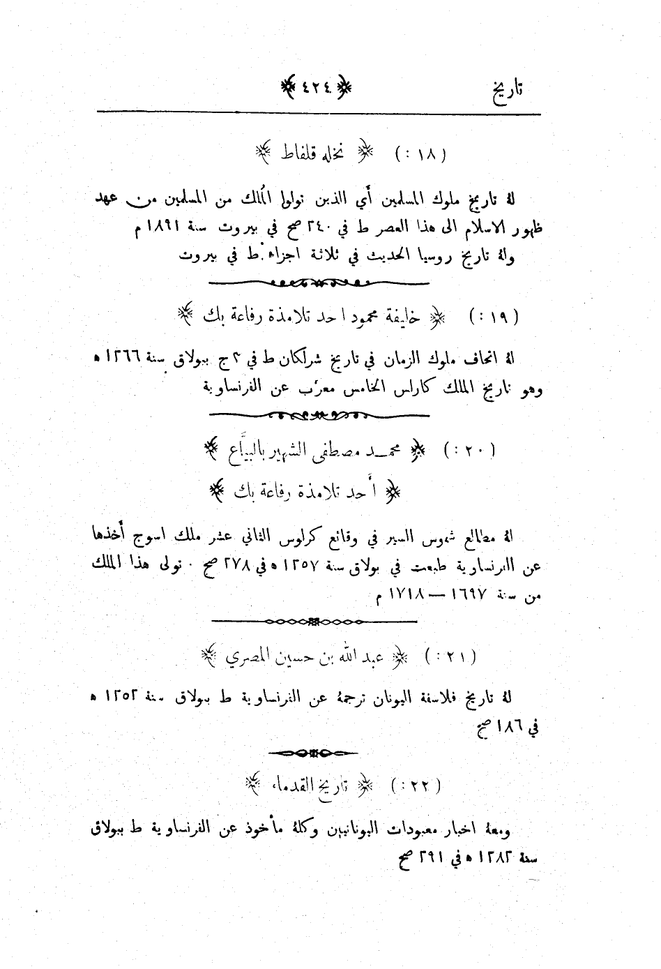 معه اخبار معبودات اليونانيين وكله مأخوذ عن الفرنسية طبع ببولاق سنة 1282هـ في 291صح