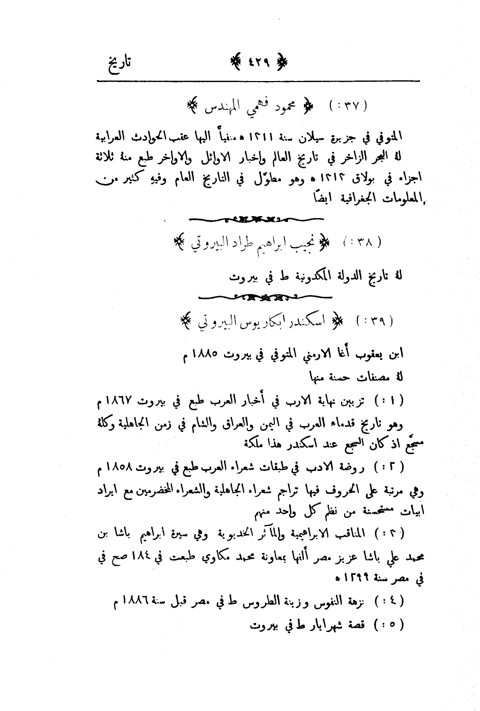 المتوفى في جزيرة سيلان 1311هـ منفياً اليها عقب الحوادث العرابية له البحر الزاخر في تاريخ العالم واخبار الاوائل والاواخر طبع منه ثلاثة اجزاء في بولاق 1313هـ وهو مطول في التاريخ العام وفيه كثير من المعلومات الجغرافية ايضا