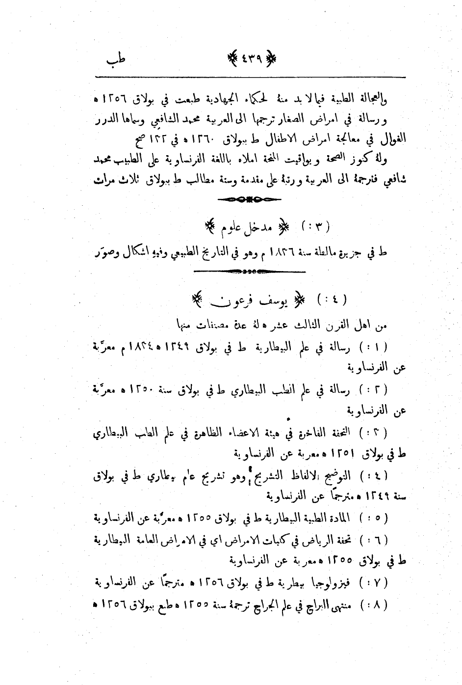 5 - المادة الطبية البيطارية طبع في بولاق 1255هـ معربة عن الفرنسية 6 - تحفة الرياض في كليات الامراض أي في الامراض العامة البيطارية طبع في بولاق 1255هـ معربة عن الفرنسية 7 - فيزولوجيا بيطرية طبع في بولاق 1256هـ مترجماً عن الفرنسية 8 - منتهى البراح في علم الجراح ترجمه سنة 1255هـ ببولاق 1256هـ
