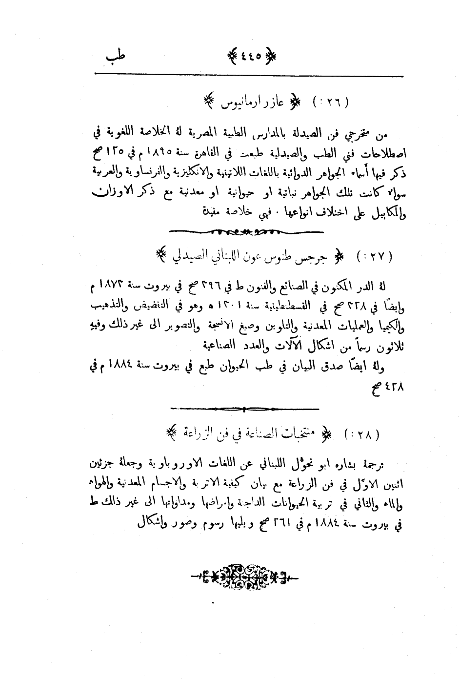 ترجمه بشارة ابو النحول اللبناني عن اللغات الاوربية وجعله تأليفها اثنين الاول في فن الزراعة مع بيان كيفية الاتربة والاجسام المعدنية والهواء والماء والثاني في تربية الحيوانات الداجنة وامراضها ومداواتها إلى غير ذلك طبع في بيروت سنة 1884م في 261صح ويليها رسوم وصور واشكال