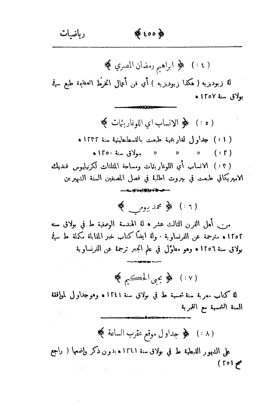 1 - جداول لوغاريتمية طبعت بالقسطنطينية سنة1232 هـ 2 - جداول لوغاريتمية طبعت ببولاق سنة 1250هـ 3 - الانساب أي اللوغاريتمات ومساحة المثلثات لكرنيليوس فنديك الامريكي طبعت في بيروت اطلبه في فصل المصنفين الستة الشهيرين