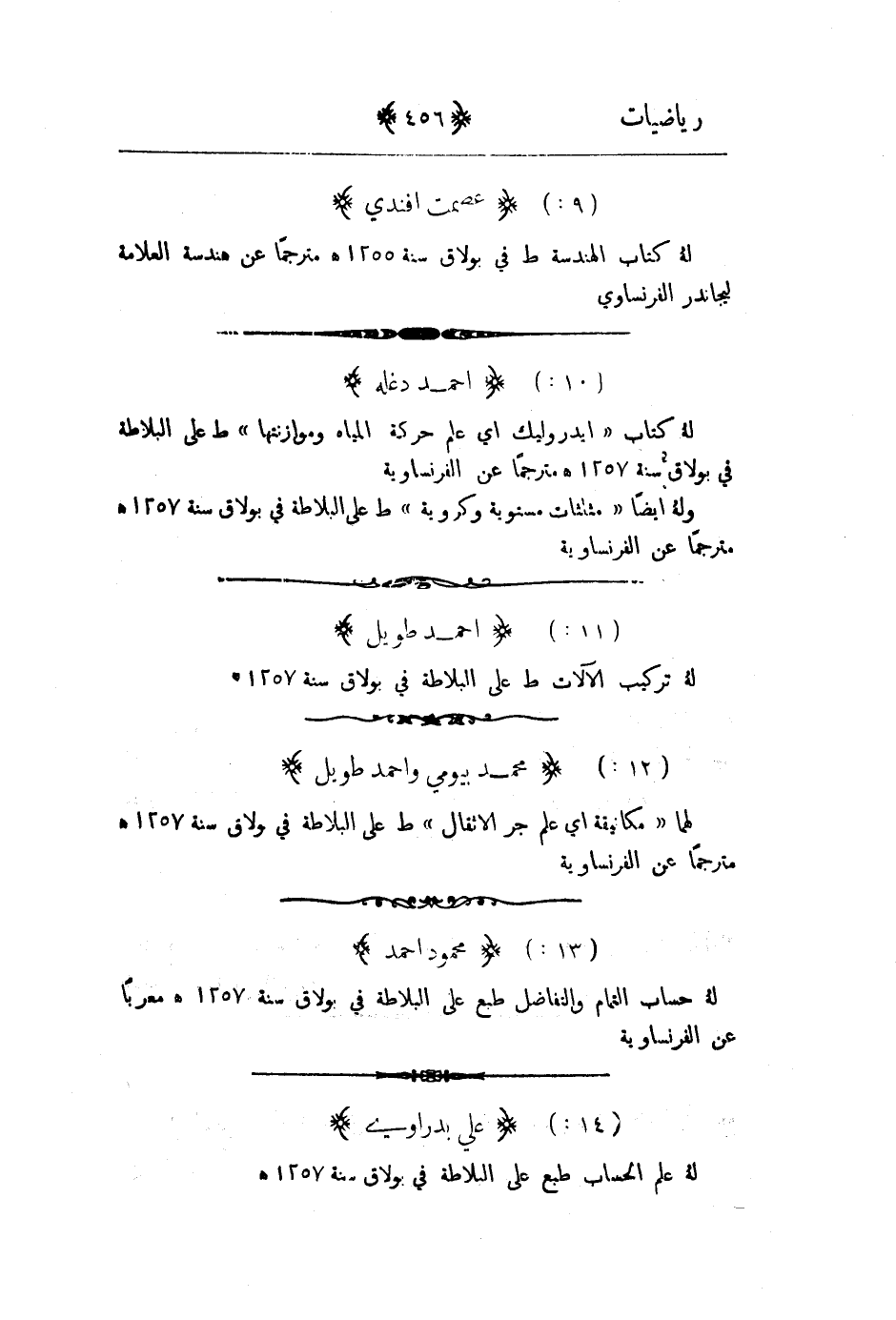له حساب التمام والتفاضل طبع على البلاطة في بولاق سنة 1257هـ معرباً عن الفرنسية