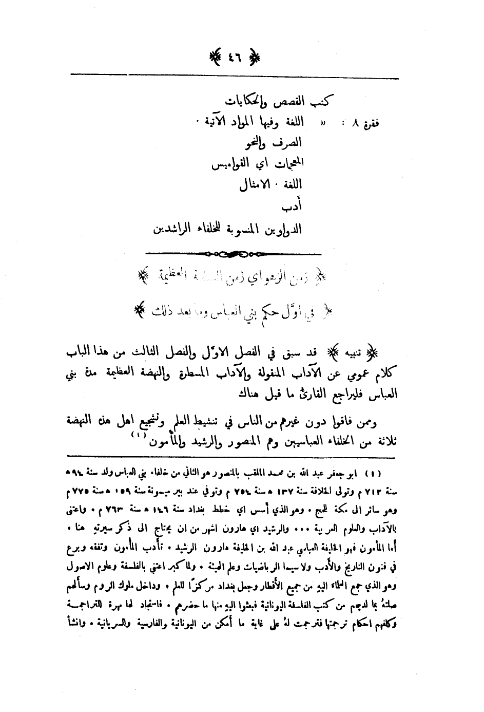قد سبق في الفصل الاول والفصل الثالث من هذا الباب كلام عمومي عن الآداب المنقولة والآداب المسطرة والنهضة العظيمة مدة بني العباس فليرجع القارئ ما قيل هناك وممن فاقوا دون غيرهم من الناس في تنشيط العلم وتشجيع اهل هذه النهضة ثلاثة من الخلفاء العباسيين وهم المنصور والرشيد والمأمون.