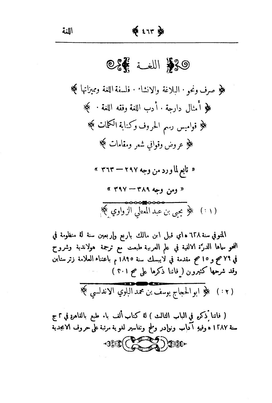 صرف ونحو. البلاعة وانشاء. فلسفة اللغة ومميزاتها. أمثال دارجة. أدب اللغة وفقه اللغة. قواميس رسم الحروف وكتابة الكلمات. عروض وقوافي شعر ومقامات